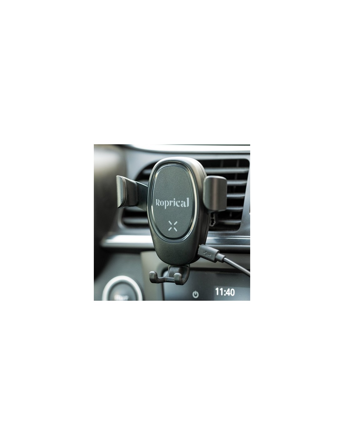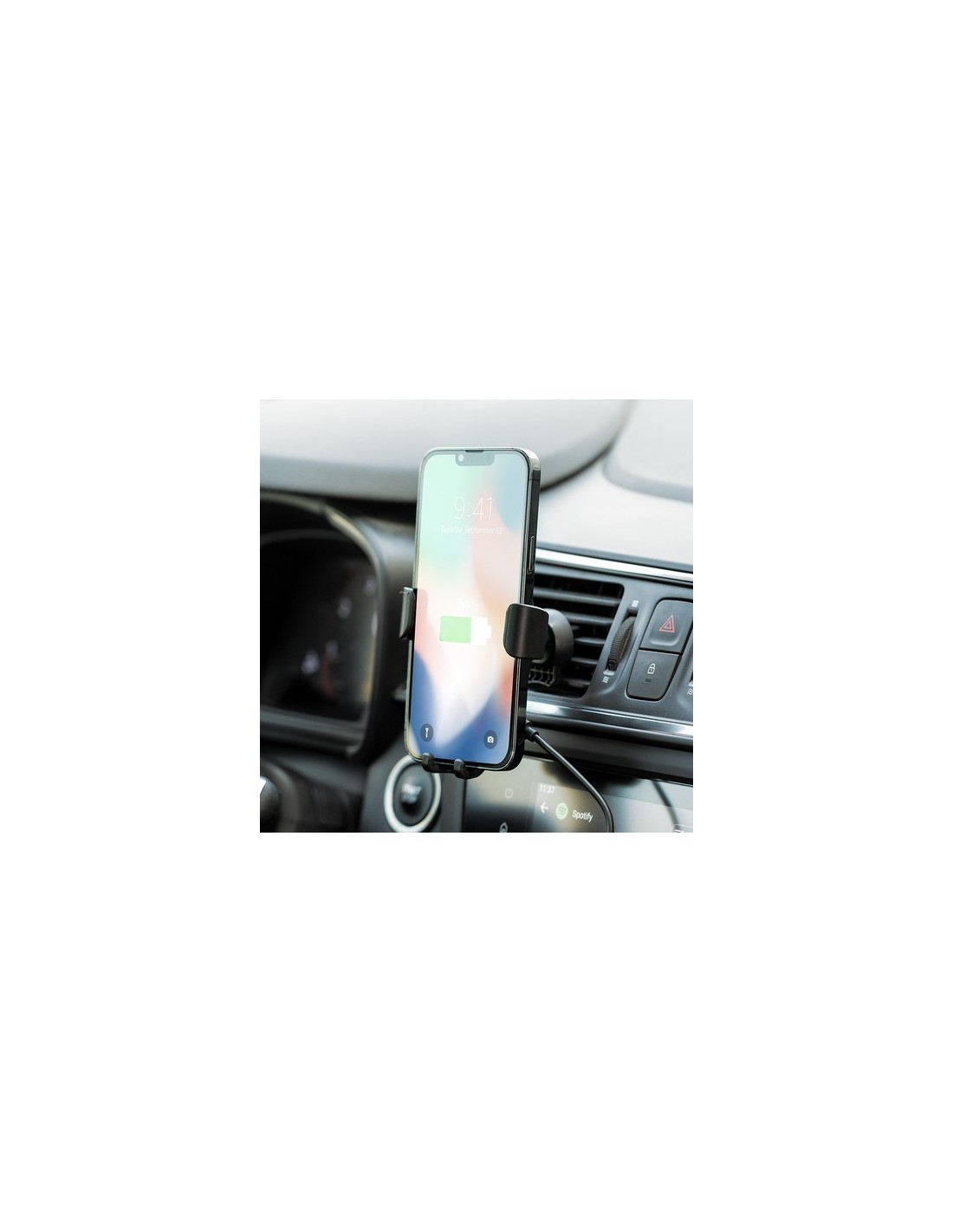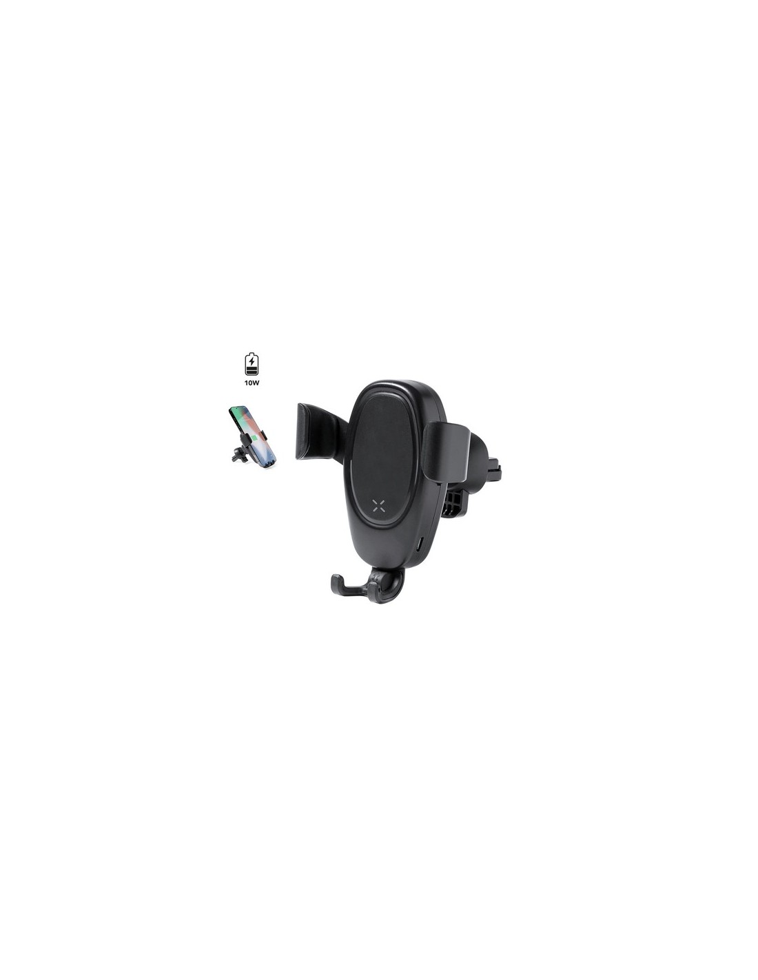 Soporte de rejilla de coche para smartphone con cargador inalámbrico 10W integrado. Mecanismo de ajuste automático universal para poder usar el dispositivo mientras se está cargando. Compatible con dispositivos equipados con tecnología de carga inalámbrica. Presentado en atractiva caja individual de diseño. Inalámbrico 10W. Ajustable