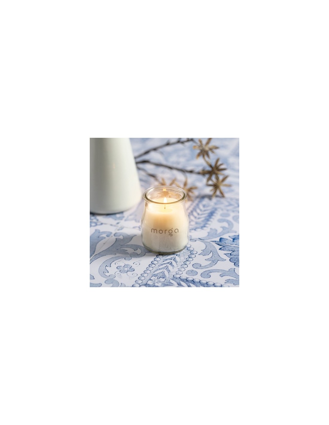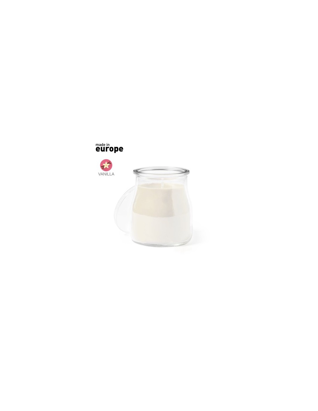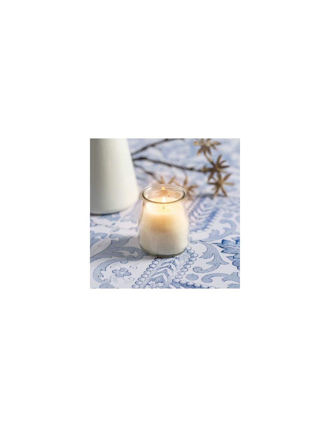 Vela aromática en tarro de cristal, disponible en aromas variados: blanco vainilla rojo frutas del bosque azul océano y verde musgo. Con distintivo Made In Europe. Composition : Cristal.