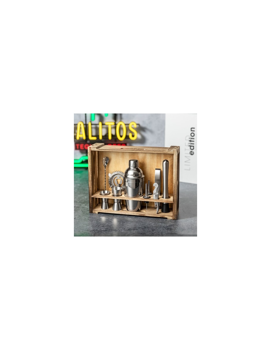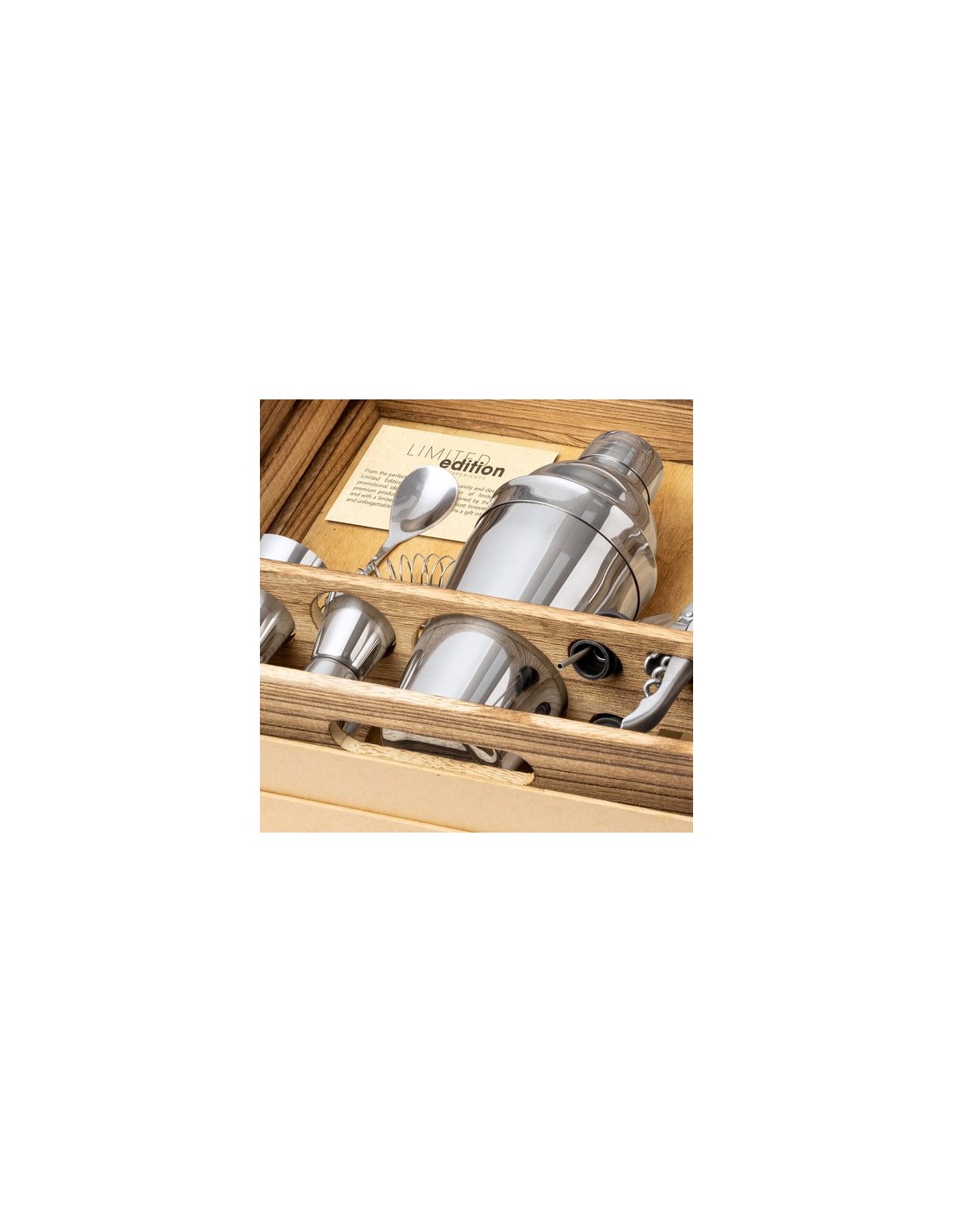 Elegante Set de Cóctel Limited Edition. Un sorprendente set que combina conceptos modernos a la par que tradicionales. Incluye todos los utensilios esenciales para configurar los mejores cócteles en acero inoxidable. Presentado en distinguida caja de madera de acado rústico ideal para almacenar y presentar: Accesorios incluidos: - 1 coctelera - 1 mortero - 1 vaso medidor de 15/30ml - 1 vaso medidor de 25/50ml - 1 pinza para hielo - 1 filtro - 1 abridor/sacacorchos - 1 cucharilla mezcladora - 2 tapones dosificadores De la perfecta combinación entre exclusividad y diseño, nace Limited Edition, una colección especial de ideas promocionales de edidición limitada. Un nuevo concepto, inspirado en la fusión de artículos premium con las últimas y más novedosas tendencias y que cuenta con una seleción limitada de unidades, convirtiendo así un regalo en una experiencia única e inolvidable. Exclusivo estuche de presentación Limited Edition, con diseño protegido por derechos de propiedad industrial. Incluida tarjeta con descripción de Limited Edition en cartón reciclado. Coctelera 550 ml. 10 Accesorios Composition : Acero Inox/ Madera.