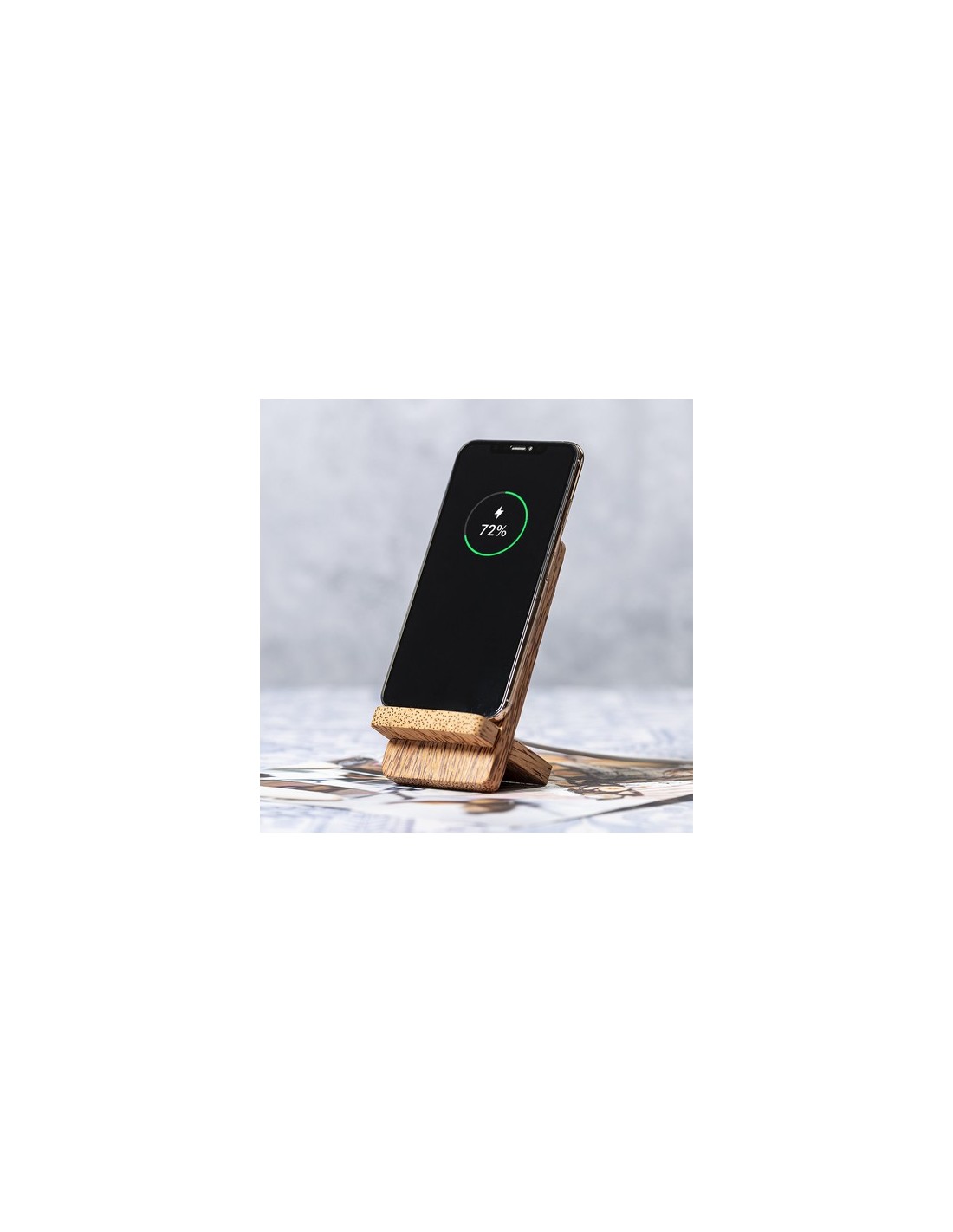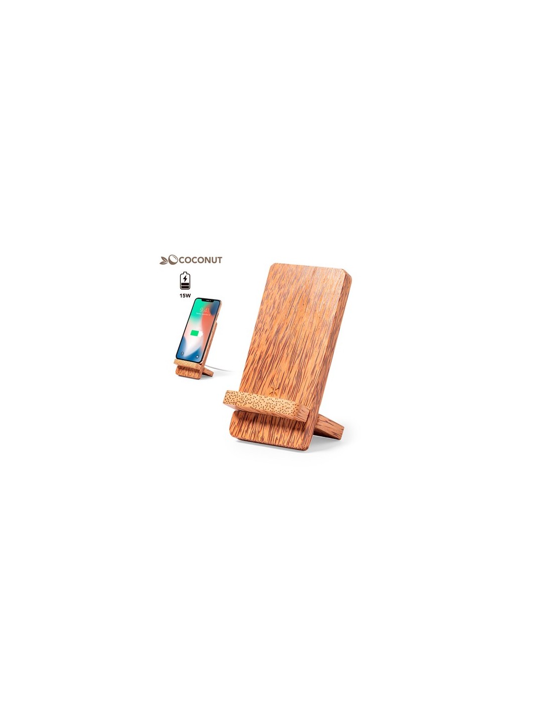 Cargador inalámbrico 15W de línea nature con función soporte para smartphone y fabricado en coco. Tras el consumo de su fruto, del coco y su planta se pueden obtener multitud de productos, contribuyendo a la sostenibilidad del planeta y fomentando el uso de materias primas naturales. Compatible con dispositivos equipados con tecnología de carga inalámbrica. Amplia superficie de marcaje y presentado en caja individual de diseño eco en cartón kraft. Inalámbrico 15W Composition : Coco.