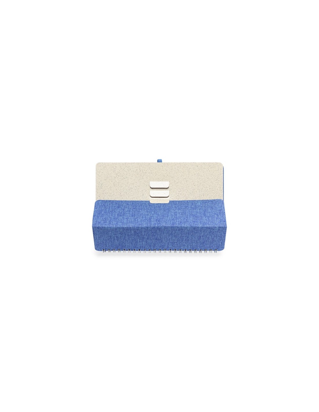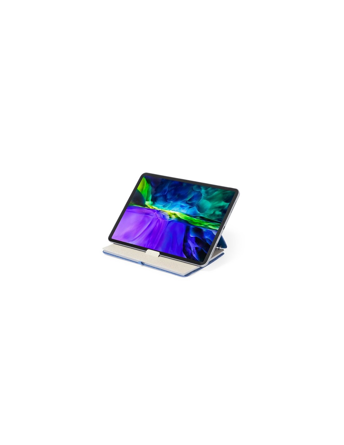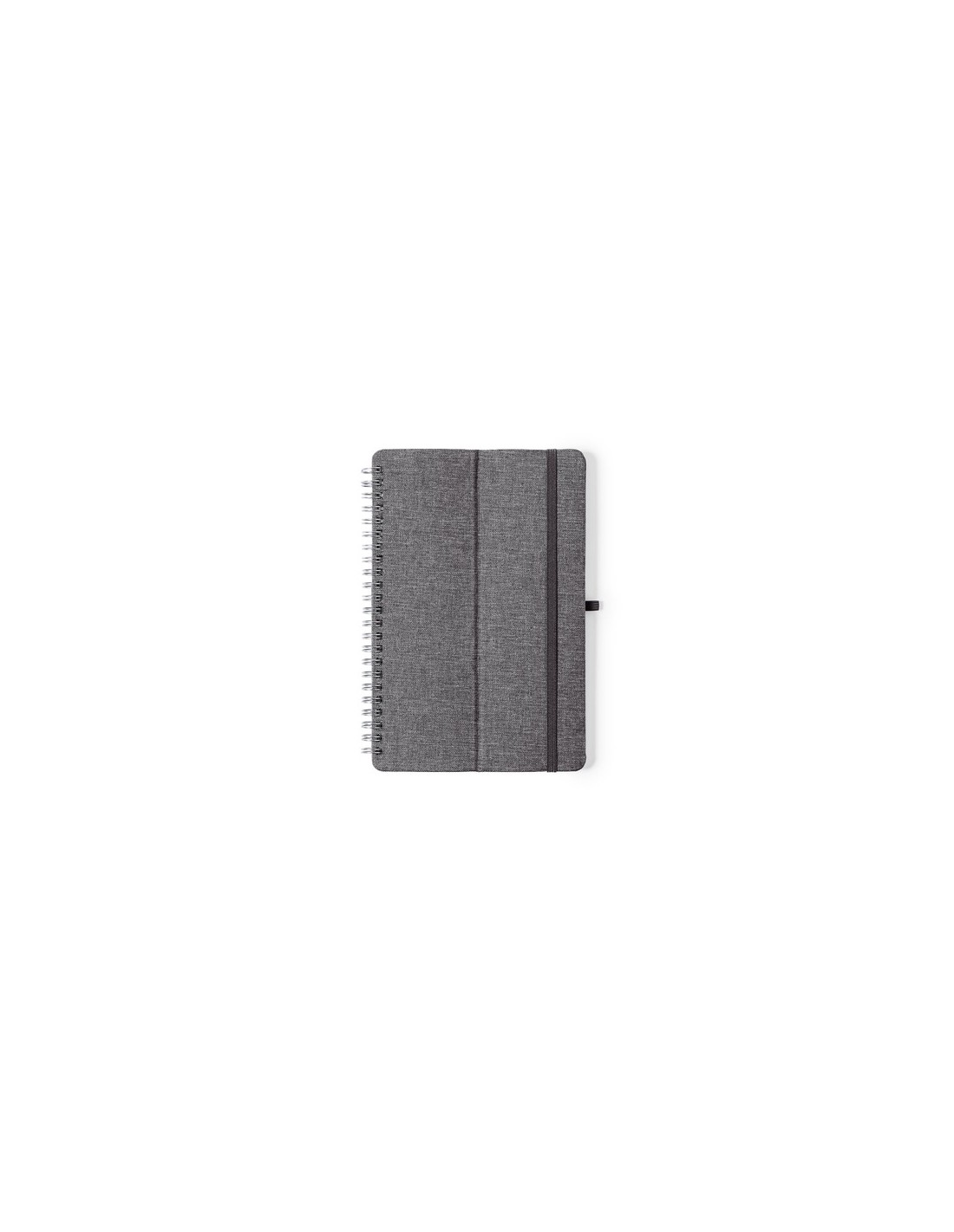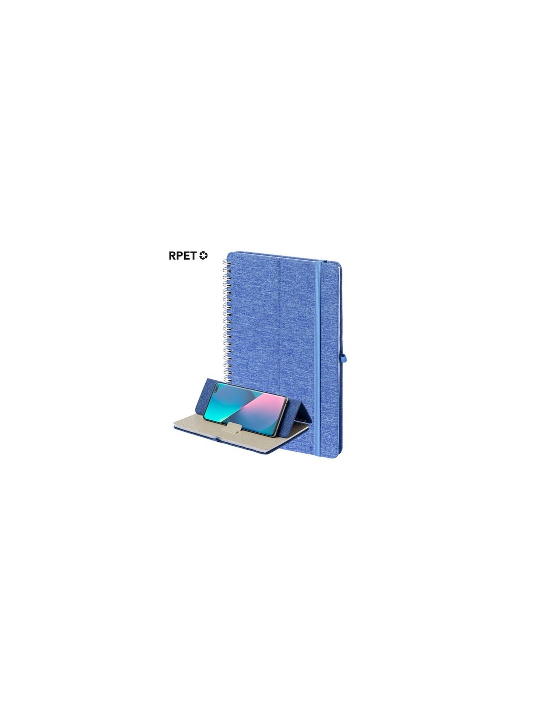 Libreta soporte de anillas de línea nature. Tapas rígidas fabricadas en resistente material RPET 300D, elaborado a partir de plástico reciclado. Con original soporte para smartphone y tablet integrado en la portada y fabricado en caña de trigo. Incluye elástico de cierre y soporte para bolígrafo a juego. 70 hojas interiores con disposición a una raya y disponible en variada gama de colores. Con distintivo RPET en contraportada y presentada en bolsa individual reciclada. Portada Rígida. 70 Hojas Composition : Poliéster 300D RPET/ Caña de Trigo/ PP.