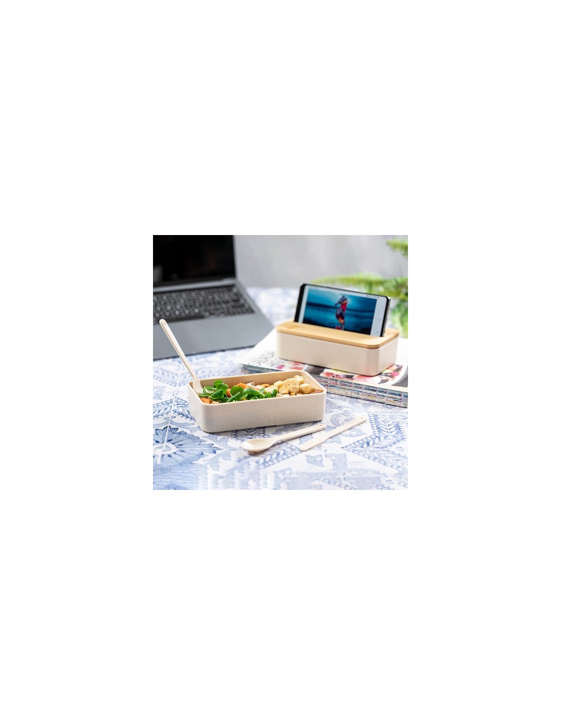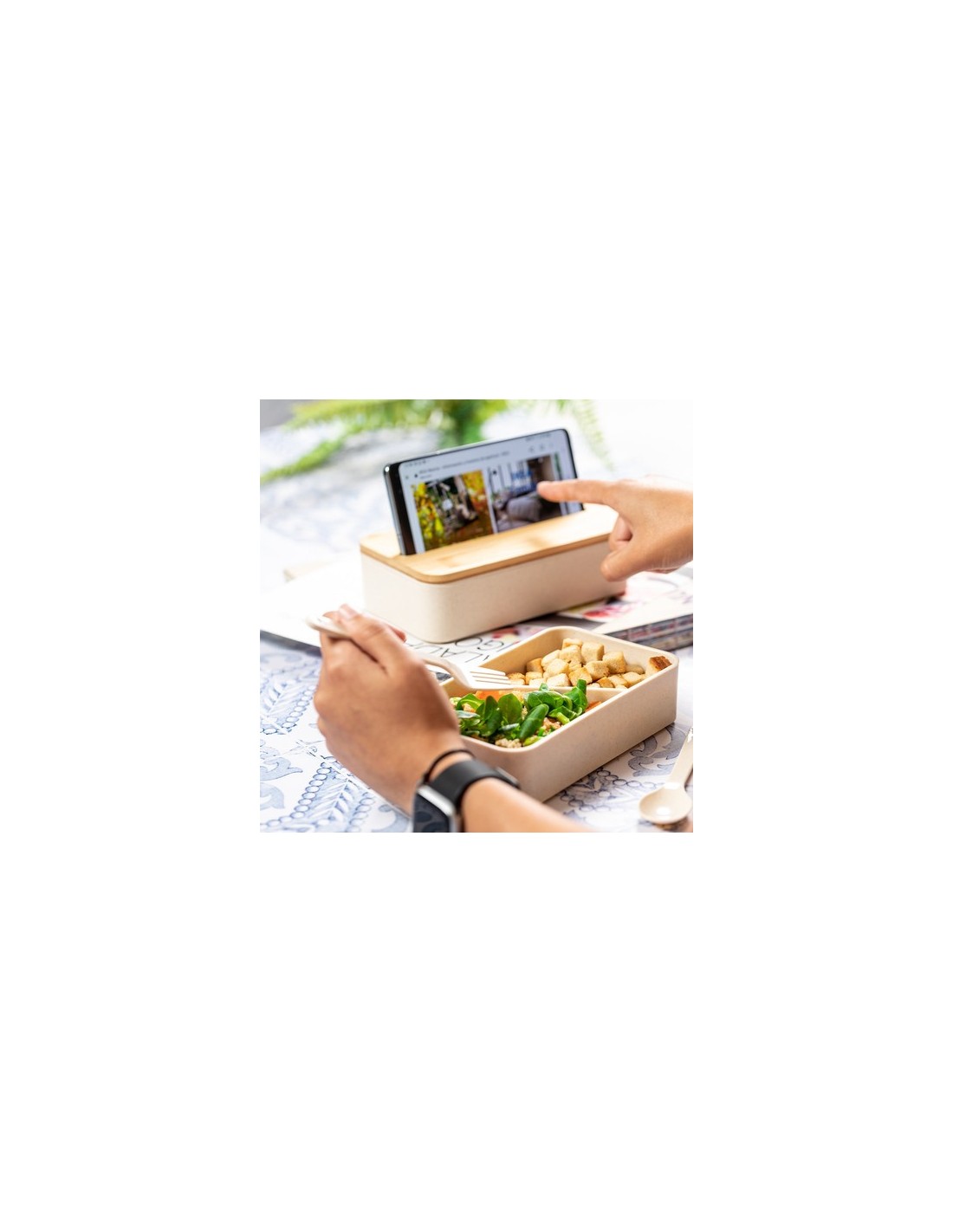 Original set de fiambreras de 1,4l en resistente material PP veteado libre de BPA. Original tapa de bambú con soporte para smartphone integrado. Dos compartimentos, cada uno de 700 ml de capacidad y compartimento interior con tenedor, cuchara y cuchillo. Incluye cinta de seguridad exterior. Certificación Food Grade, garantizando la seguridad cuando los alimentos entran en contacto con el material usado para fabricar el producto. 2 Compartimentos 700 ml Composition : PP/ Bambú.