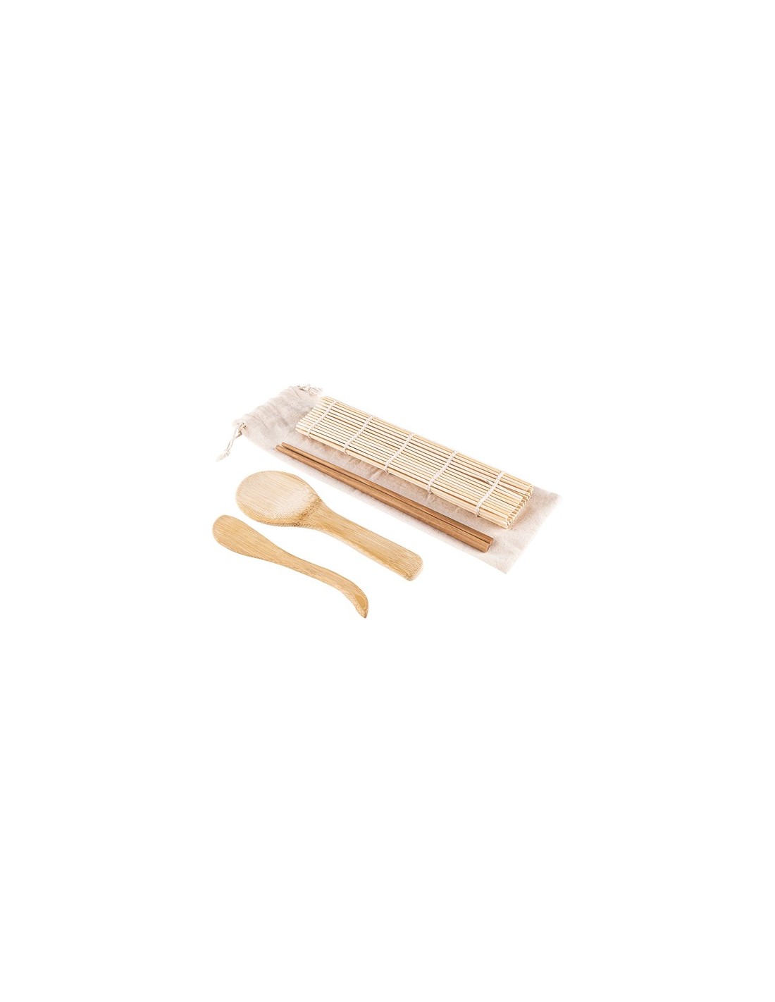 Set de bolsa con 5 piezas para hacer sushi. Con esterilla, 2 pares de palillos, 1 paleta de arroz y 1 esparcidor. Material : Bambú Tecnica De Marcaje : SUPLEMENTO EMBOLSADO INDIVIDUAL, CODIGO B TAMPOGRAFIA A 1 COLOR, LASER MADERA 2, FULL PRINT MEDIDA DTF1, FULL PRINT MEDIDA DTF2, FULL PRINT MEDIDA DTF3, FULL PRINT MEDIDA DTF4, CODIGO K SERIGRAFIA A 1 COLOR, TRANSFER SERIGRAFICO MAX.6X9, 5 CM-1COLOR, 5 CM- 2COLORES, TRANSFER SERIGRAFICO MAX.9, 5X14 CM - 1COLOR, 5X14 CM- 2COLORES, TRANSFER SERIGRAFICO MAX.12X23 CM - 1COLOR, TRANSFER SERIGRAFICO MAX.12X23 CM - 2COLORES, TRANSFER SERIGRAFICO MAX.20X28 CM - 1COLOR, TRANSFER SERIGRAFICO MAX.20X28 CM - 2COLORES
