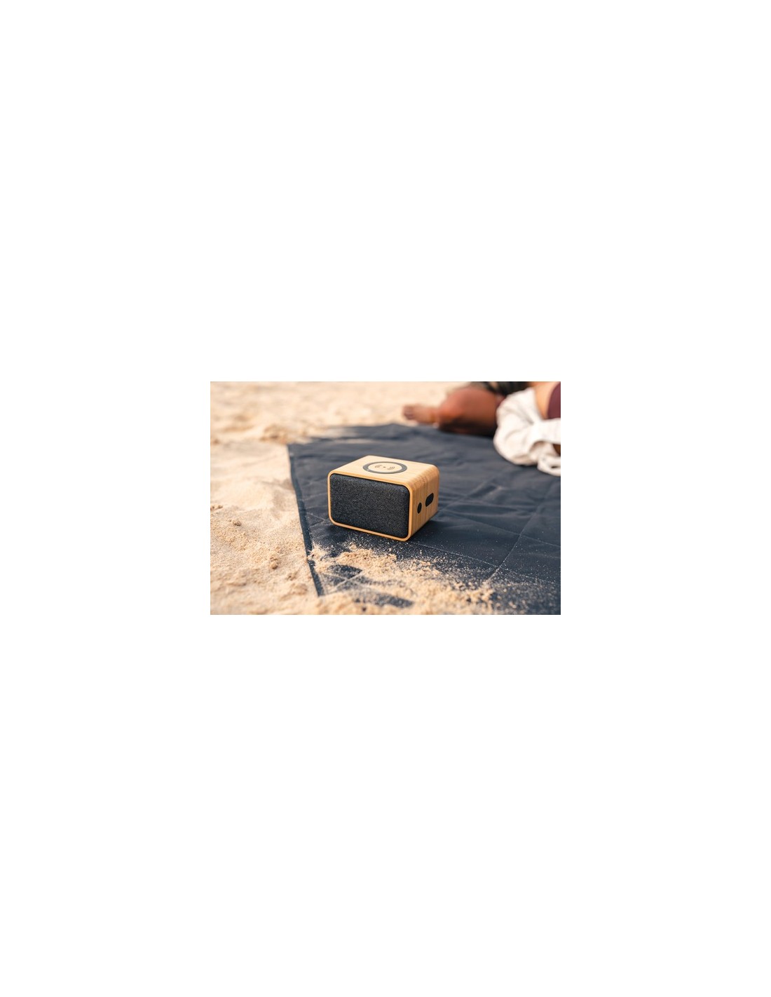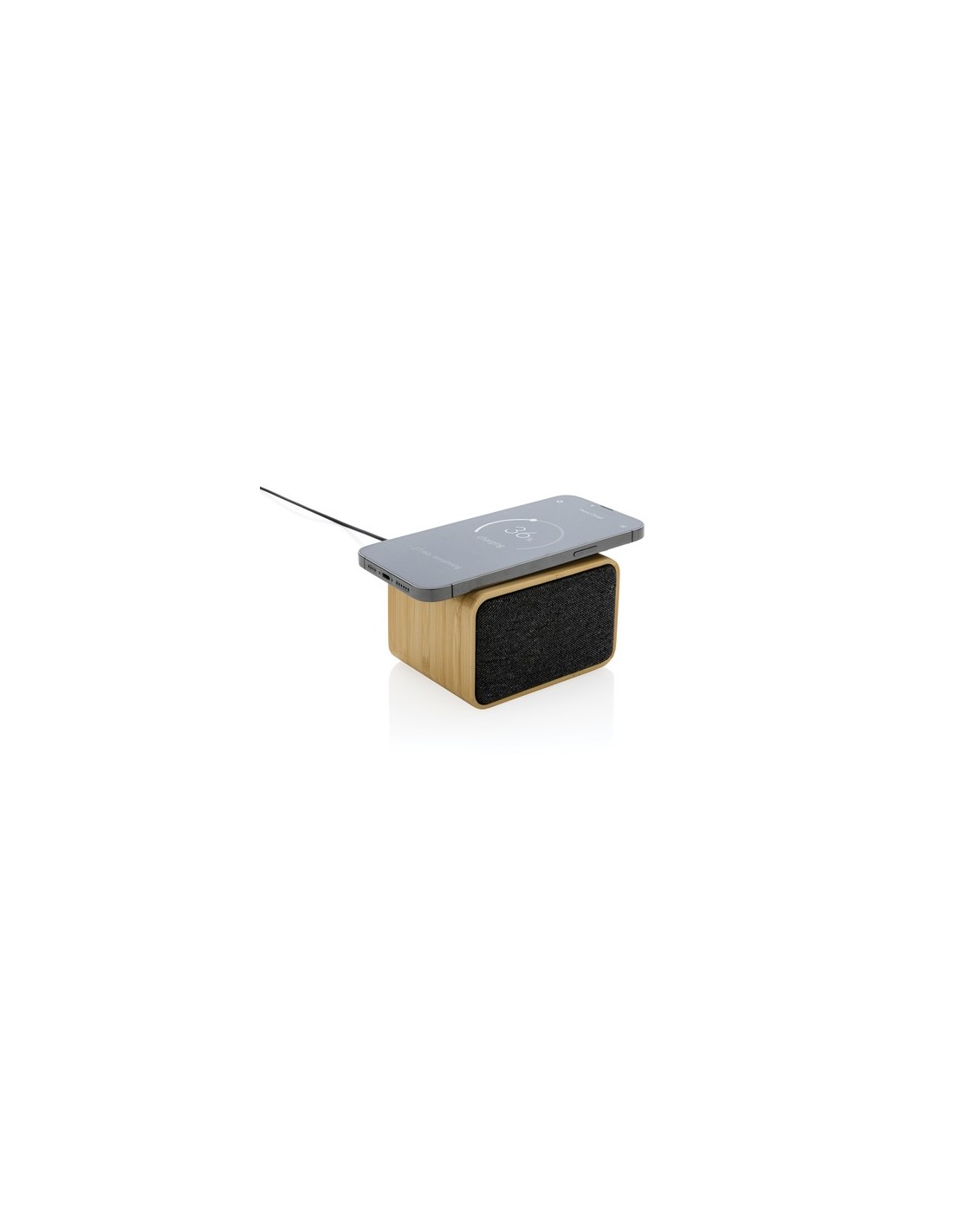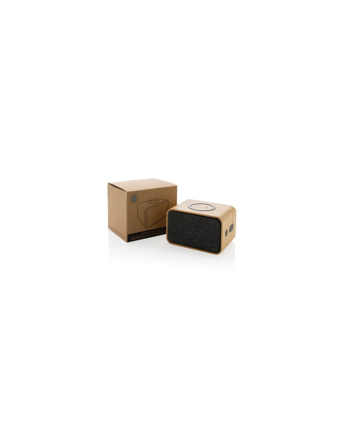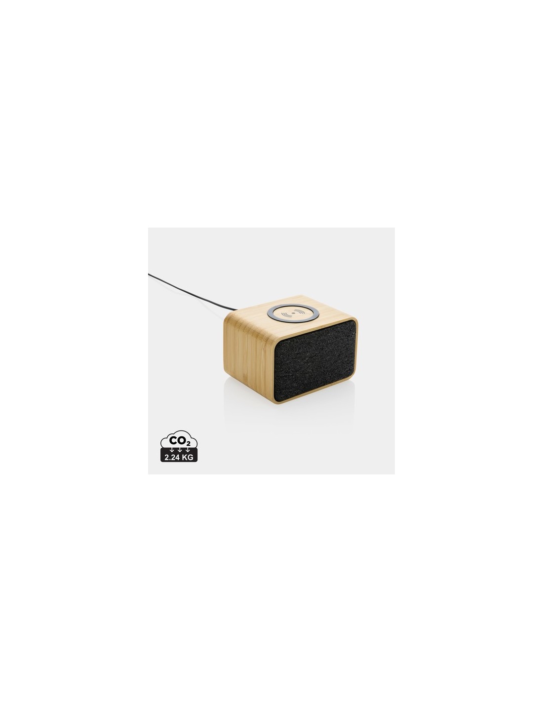 Altavoz inalámbrico de 3W con cargador inalámbrico de 5W integrado en la parte superior. Fabricado con exterior 100% bambú FSC®, ABS y PET reciclados con certificación RCS (Recycled Claim Standard). Contenido reciclado total: 37% basado en el peso total del artículo. La certificación RCS garantiza una cadena de suministro completamente certificada de los materiales reciclados. El altavoz está equipado con una batería de 1200 mAh para garantizar hasta 5 horas de tiempo de reproducción y BT5.0 para una conexión fluida y un sonido claro. Rango de conexión de hasta 10 metros. Con micrófono y función de descolgar para contestar llamadas. Presentado en caja kraft mixta FSC. Incluye cable de carga de TPE reciclado certificado GRS de 100 cm. Artículo y accesorios 100% libres de PVC. Material : FSC® bambú, ABS reciclado Recycled Content Percent : 37 Conforme directiva equipamientos Radio y Telecomunicaciones 2014/53/EU, Conforme directiva de sustancias peligrosas 2011/65/EC & 2015/863, Hoja de datos de seguridad del material disponible, Conforme PAHS content in Reach & ZEK 01-4-08, Conforme directiva Phtalate content, Conforme directiva Battery transportation safety UN38.3, Certificado para transporte aéreo, Libre de parafinas cloradas de cadena corta y media., certificado de Recycled Claim Standard, La certificación de gestión forestal del FSC confirma que el bosque se gestiona de forma que se preserva la diversidad biológica y se beneficia la vida de la población y los trabajadores locales, al tiempo que se garantiza la viabilidad económica WEEE Battery : 1 Li-poli - 37 g. Packaging : Caja de regalo All print codes : CO2 Engraving 2,Pad Print - Print code default : Grabado CO2 - lado izquierdo del artículo - 70 x 40 mm - max color : 1 Social Audits : BSCI Total CO2 emissions : 2,24.