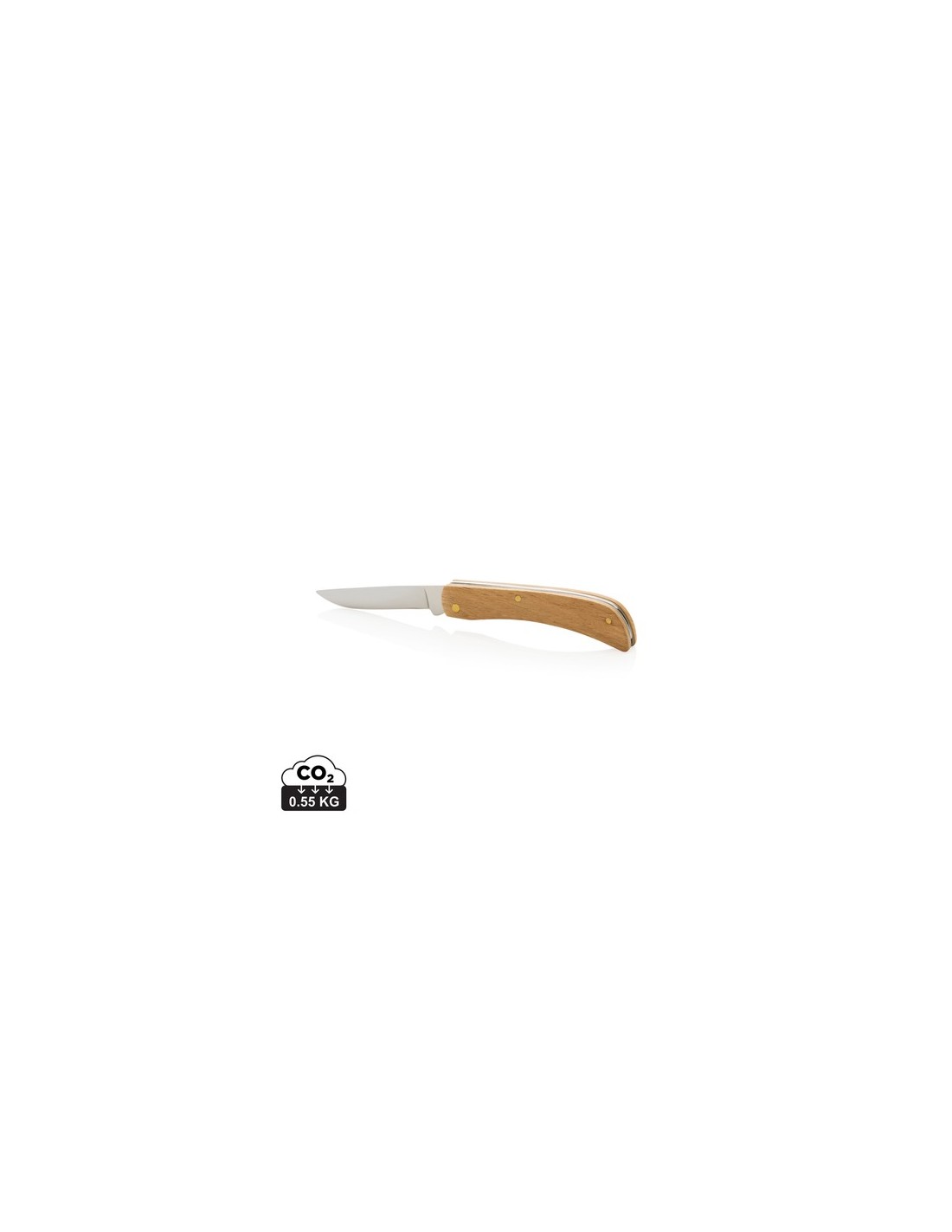 Navaja plegable fabricada con madera 100% FSC y hoja de acero inoxidable (420) de alta calidad. Dureza Rockwell 42-52. Navaja totalmente apta para alimentos. Presentada en caja kraft con mezcla FSC. Material : FSC® Madera, Acero inoxidable Recycled Content Percent : 0 Conforme directiva seguridad Alimentos 1935/2004/EC & 2020/1245, Conforme directiva PCP content 1999/51/EC, Conforme directiva test libre níkel BS EN 1811:2012 y A:2015 Packaging : Caja de regalo All print codes : CO2 Engraving 2,Pad Print - Print code default : Grabado CO2 - lado izquierdo del artículo - 65 x 5 mm - max color : 1 Social Audits : BSCI Total CO2 emissions : 0,55.