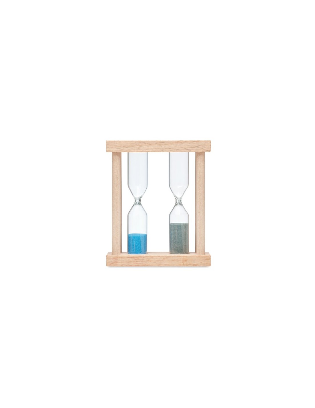 Reloj de arena doble. Hecho de madera y con 2 temporizadores diferentes (aprox. 3 y 5 minutos).