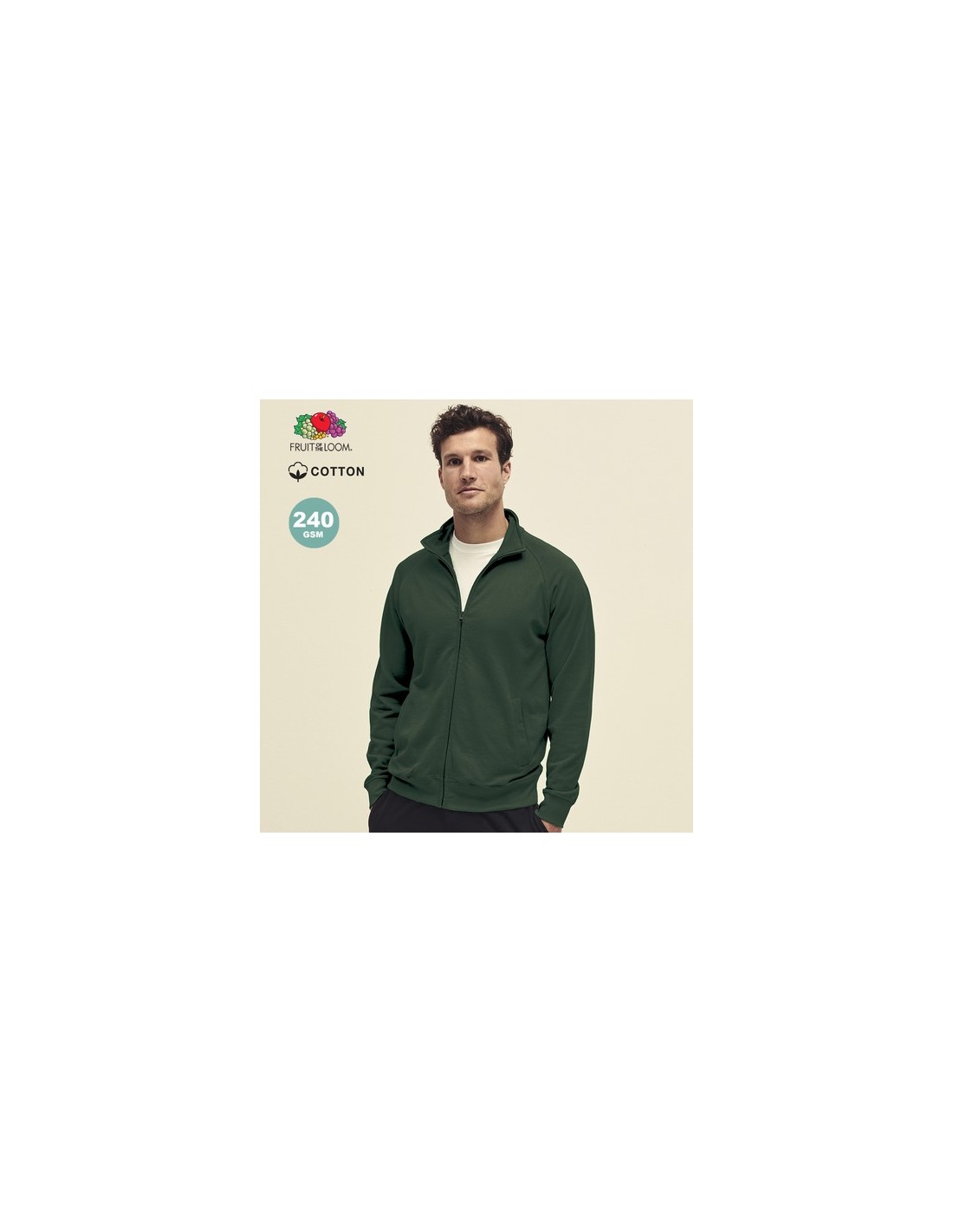 Sudadera para adulto Lightweight Sweat Jacket de Fruit Of The Loom. Fabricada en felpa ligera sin cepillar, en combinación de materiales 80% algodón + 20% poliéster de 240g/m2. Con cierre de cremallera a juego, mangas de ranglán y 2 bolsillos delanteros. Cintura y puños en algodón/ LYCRA. Disponible en variada gama de colores y en tallas S, M, L, XL, XXL. Composition : 80% Algodón/ 20% Poliéster 240 g/ m2.
