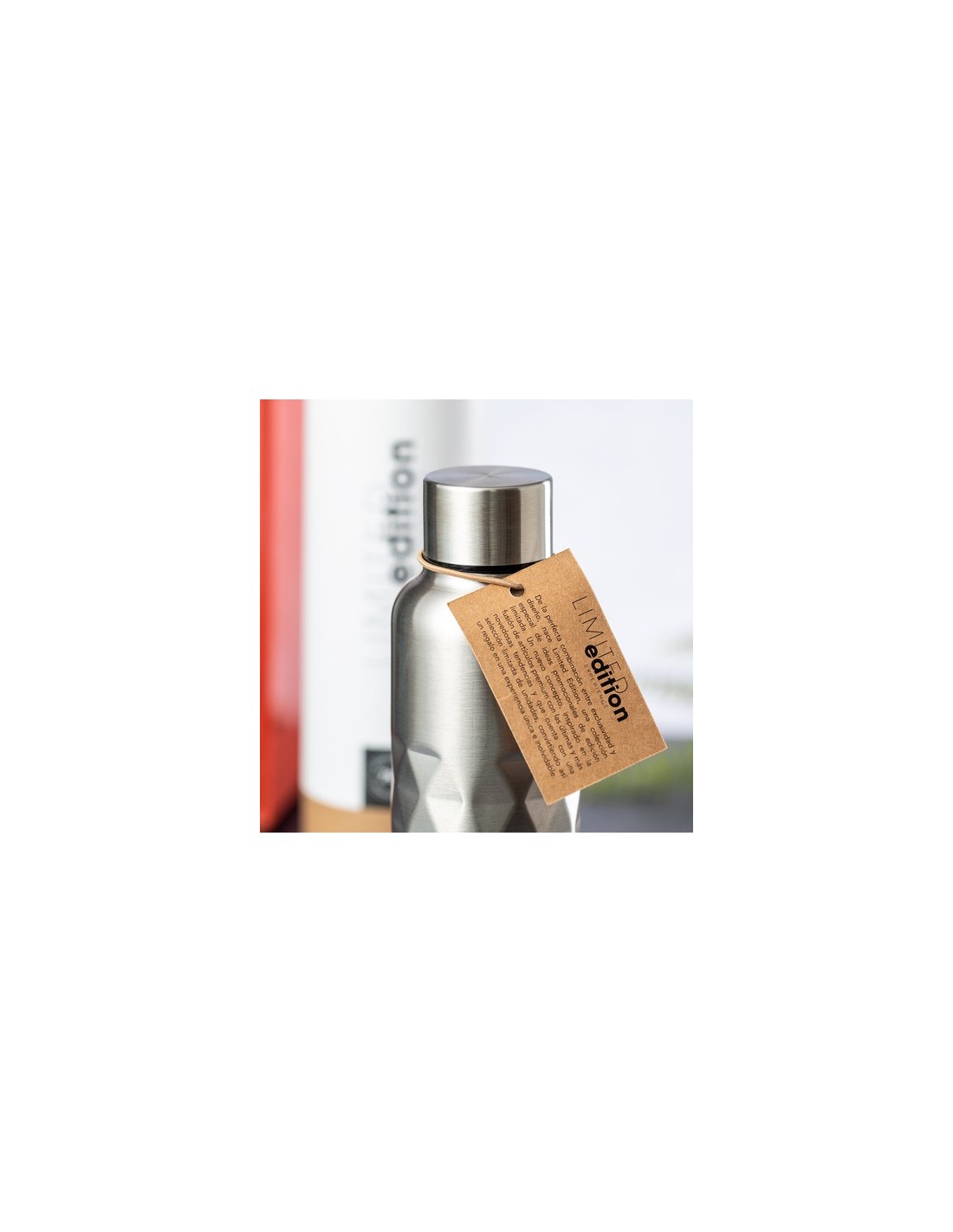 Bidón de diseño exclusivo Limited Edition. De 850 ml de capacidad y fabricado en resistente acero inox de acabado mate, con elegante patrón en rombo alrededor del cuerpo.Presentación en estuche Limited Edition Experience, de diseño único y protegido por derechos de propiedad industrial. Incluida tarjeta en cartón reciclado con descripción Limited Edition.De la perfecta combinación entre exclusividad y diseño nace Limited Edition, una colección especial de ideas promocionales de edición limitada. Un nuevo concepto, inspirado en la fusión de artículos premium con las últimas tendencias, en tiradas de unidades limitadas, y ofreciendo una experiencia de regalo única, exclusiva e inolvidable. 850 ml Composition : Acero Inox.