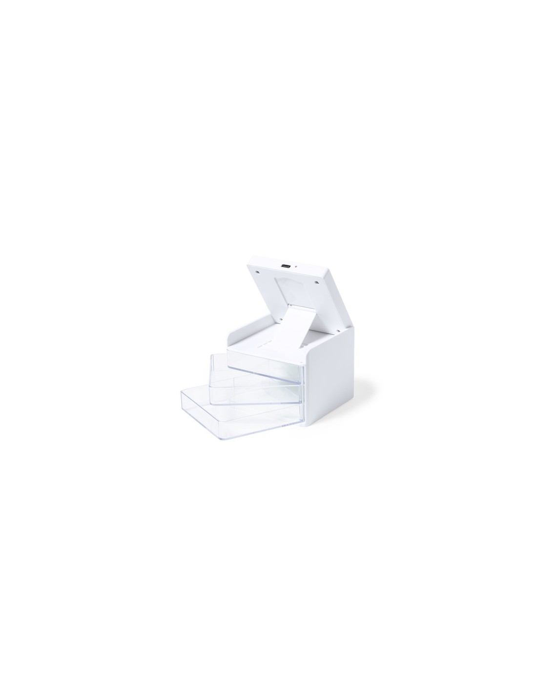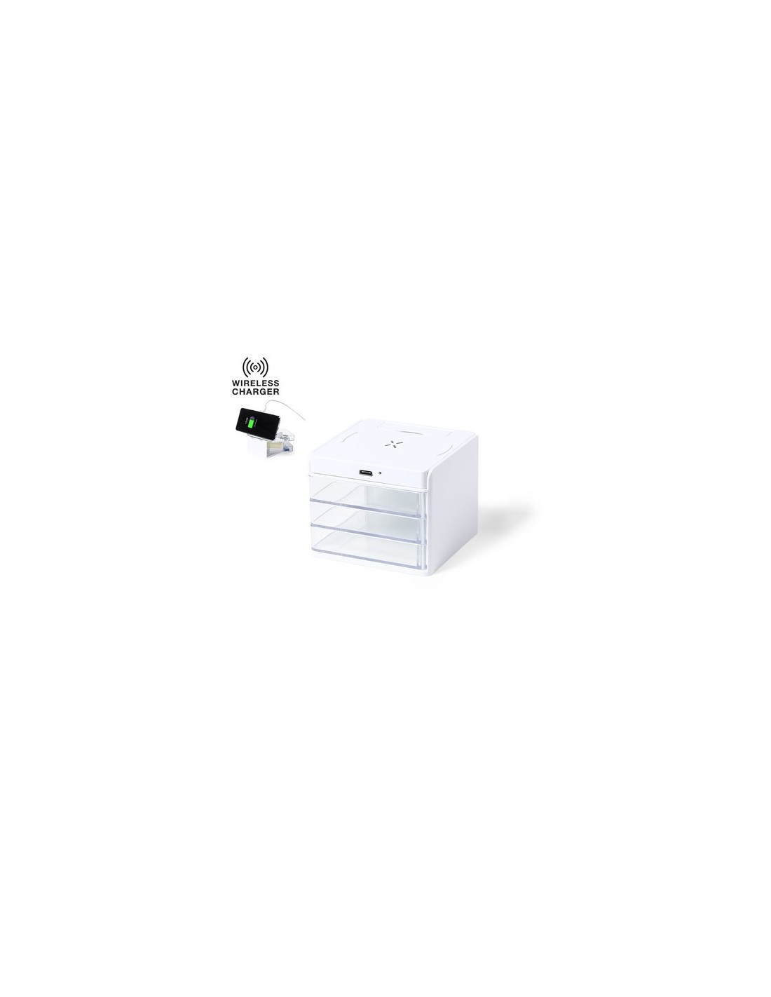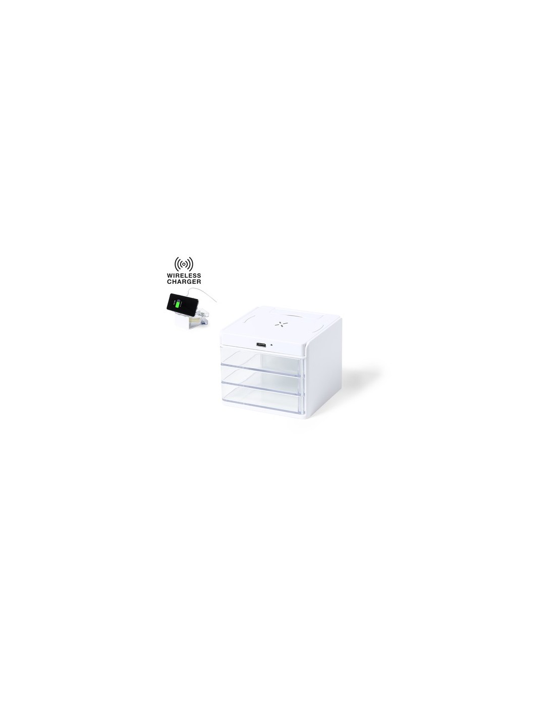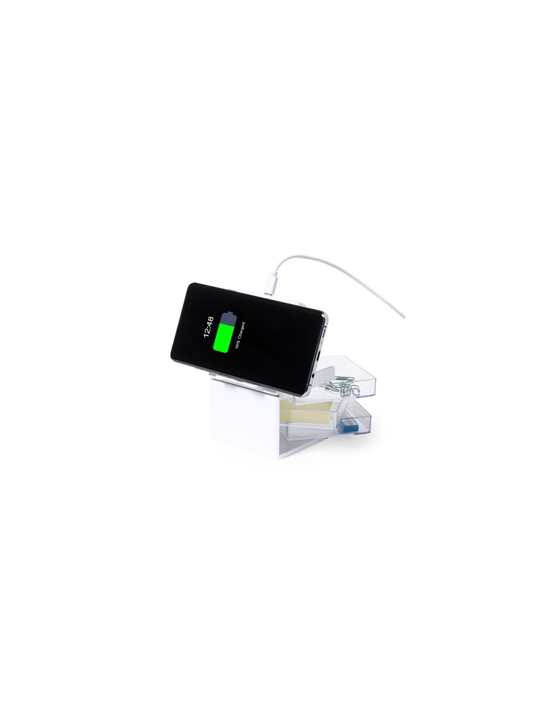 Cargador organizador con soporte para smartphone y cargador inalámbrico 10W integrado, compatible con dispositivos equipados con tecnología de carga inalámbrica Qi. Con 3 compartimentos de almacenaje transparentes y extraíbles. Indicador de estado de carga, con cable de carga Tipo C de 1 m incluido. Base antideslizante y presentado en caja individual de diseño kraft, con manual de instrucciones en español e inglés.Fabricado conforme a los estándares RoHS y en cumplimiento con los siguientes requisitos de seguridad:Sistema de protección contra sobrecalentamiento.Sistema de protección contra sobrecarga.Sistema de bloqueo para evitar cortocircuitos. Inalámbrico 10W