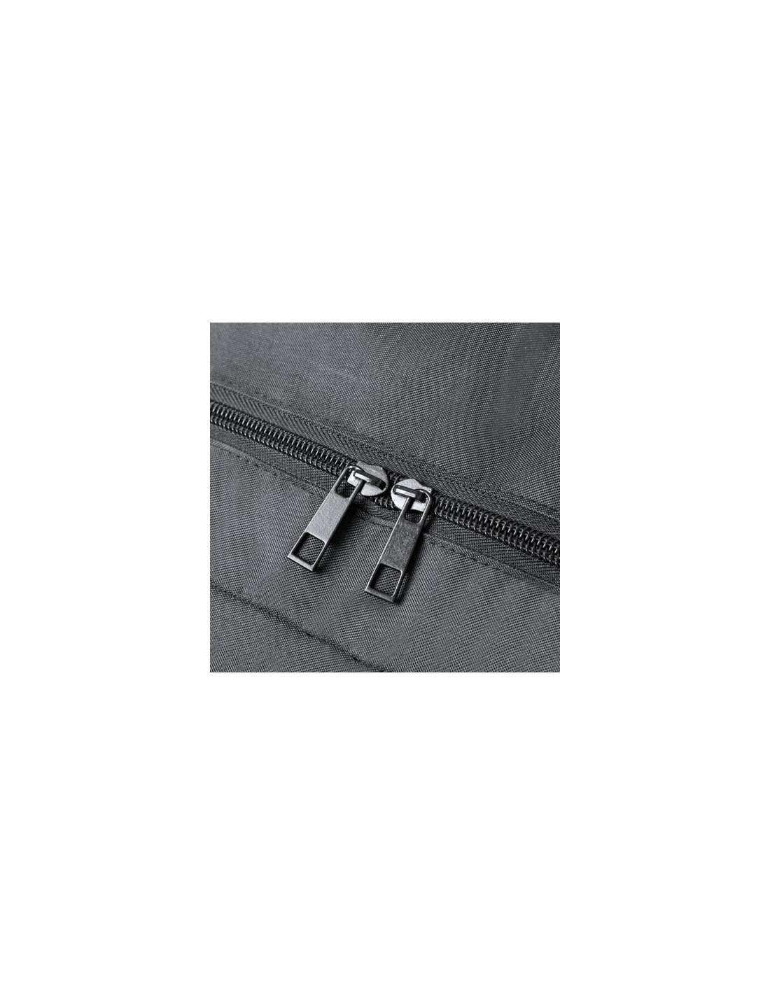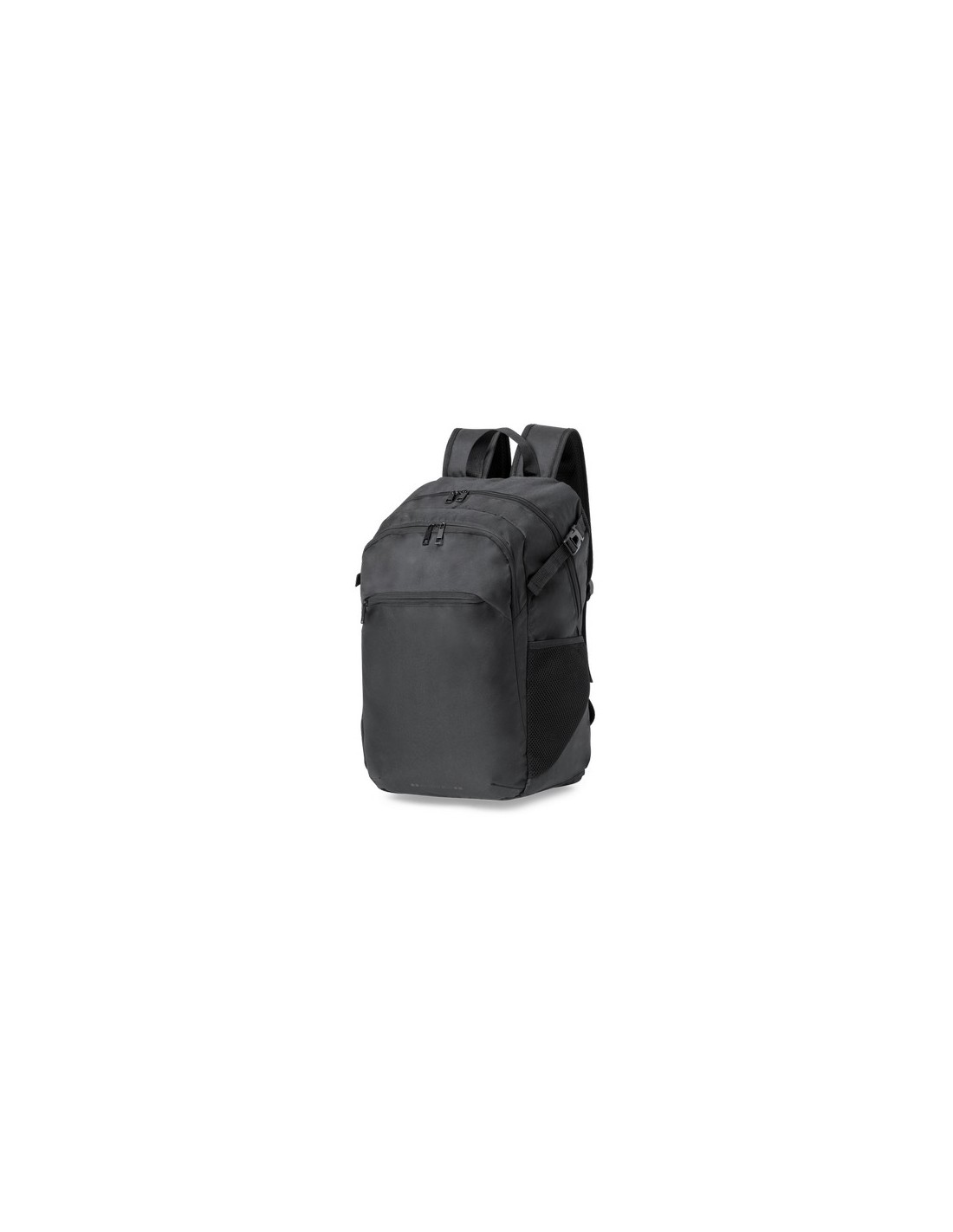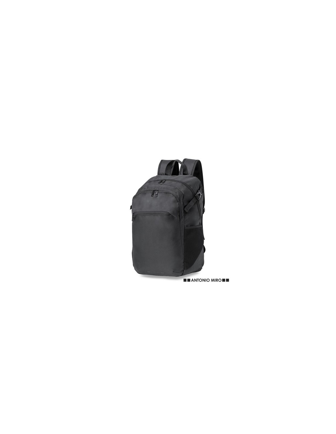 Mochila de Antonio Miró, fabricada en resistente poliéster 300D con acabados en negro. Compartimento principal y bolsillos exteriores con cierre de cremallera a juego asa de transporte y bolsillos laterales. Cintas de ajuste laterales con cierre de hebilla y logotipo de la marca en la base. Compartimentos interiores acolchados para ordenador portátil de hasta 17 pulgadas y tablet de hasta 10 pulgadas. Parte trasera acolchada y cintas para hombros ajustables y acolchadas con accesorio de ajuste en la parte trasera para barra de trolley. Bolsillo Acolchado para Portátil y Tablet. Parte Trasera y Cintas Acolchadas Composition : Poliéster 300D.