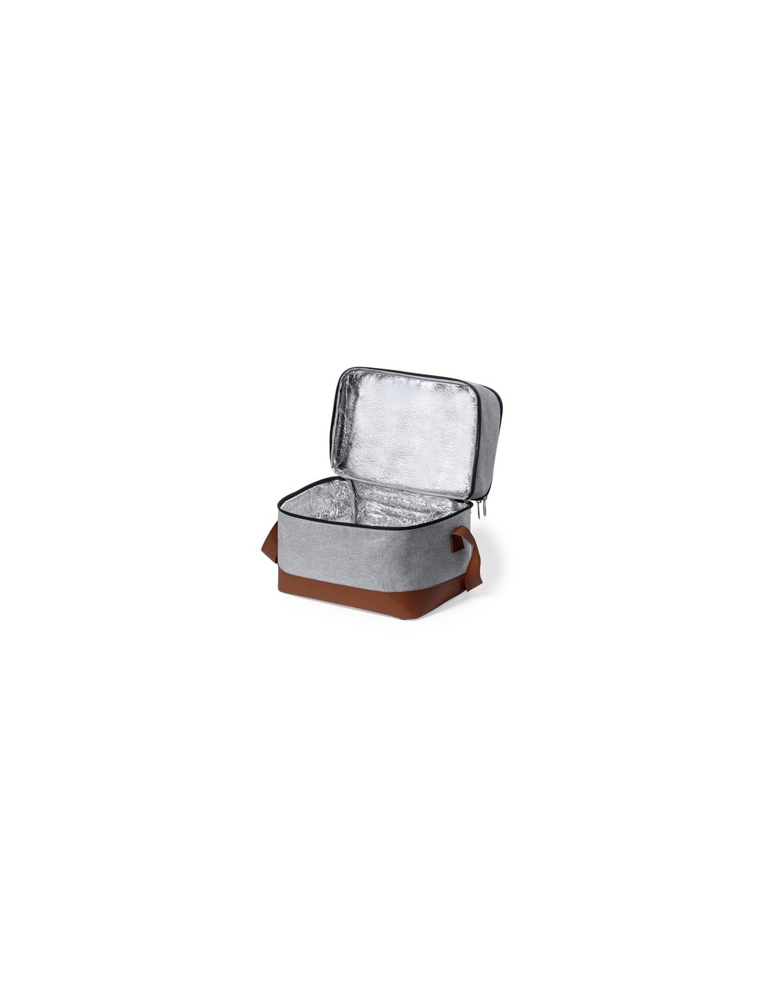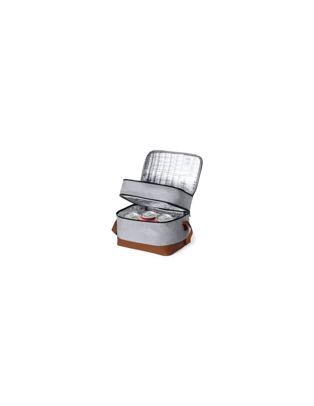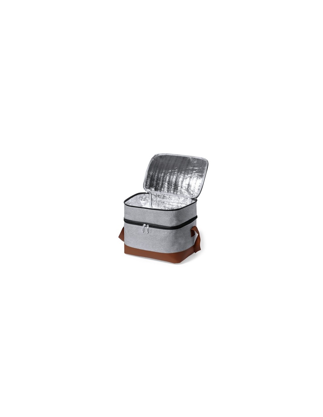Nevera fabricada en resistente 600D RPET. Acabado en color gris, con base y cinta bandolera de transporte en polipiel marrón. Incluye 2 compartimentos independientes, con cierre de cremallera y tiradores metálicos. Interior isotermo en aluminio y etiqueta exterior con distintivo RPET.El material RPET se elabora a partir de plástico reciclado, para así fomentar la reutilización de residuos plásticos y ayudar a la sostenibilidad del planeta. Composition : Poliéster 600D RPET/ Polipiel/ Aluminio.