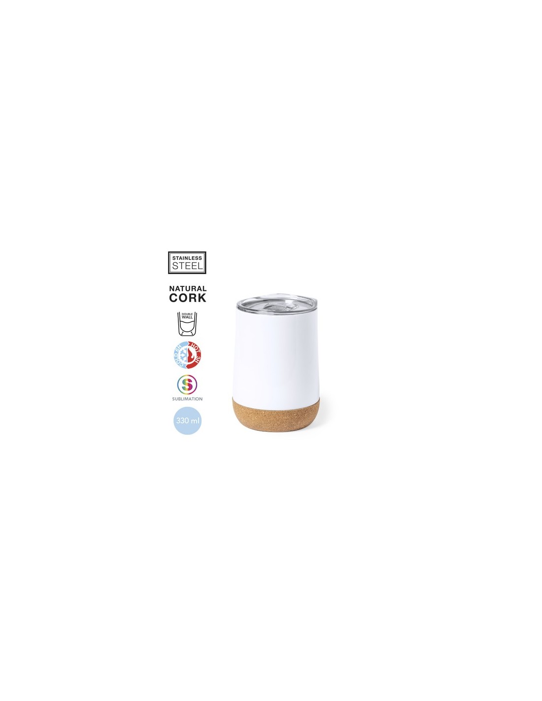 Vaso térmico fabricado en acero inox de doble pared y 330ml de capacidad. Especialmente diseñado para marcaje en sublimación, acabado en blanco brillo. Con dosificador abrefácil en tapa, libre de BPA, y base en corcho natural. Es ideal para tener en tu escritorio, mesa o en cualquier superficie donde disfrutar tranquilamente de tu bebida favorita. 330 ml Composition : Acero Inox/ Corcho.