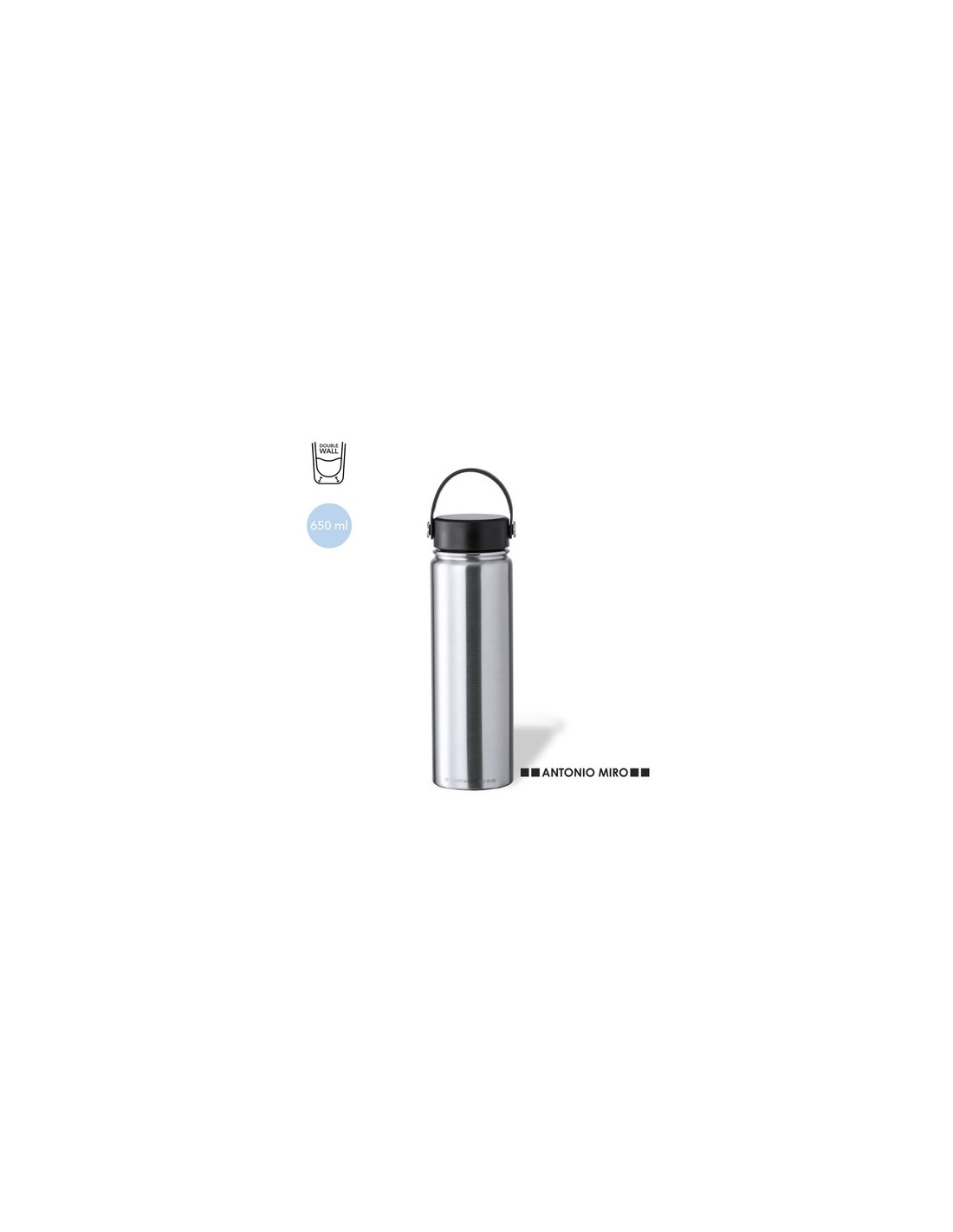 Bidón térmico de Antonio Miró y 650 ml de capacidad. Fabricado en acero inox de doble pared y acabado satinado. Con tapón a rosca en negro y cinta de transporte a juego en silicona. Con logotipo Antonio Miró en cuerpo y presentado en caja individual negra con logotipo de la marca.Disponible manual de instrucciones en español e inglés. 650 ml Composition : Acero Inox.