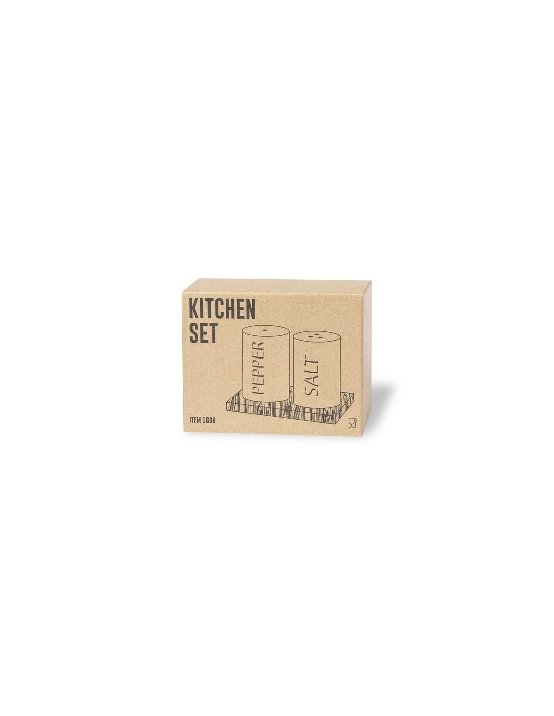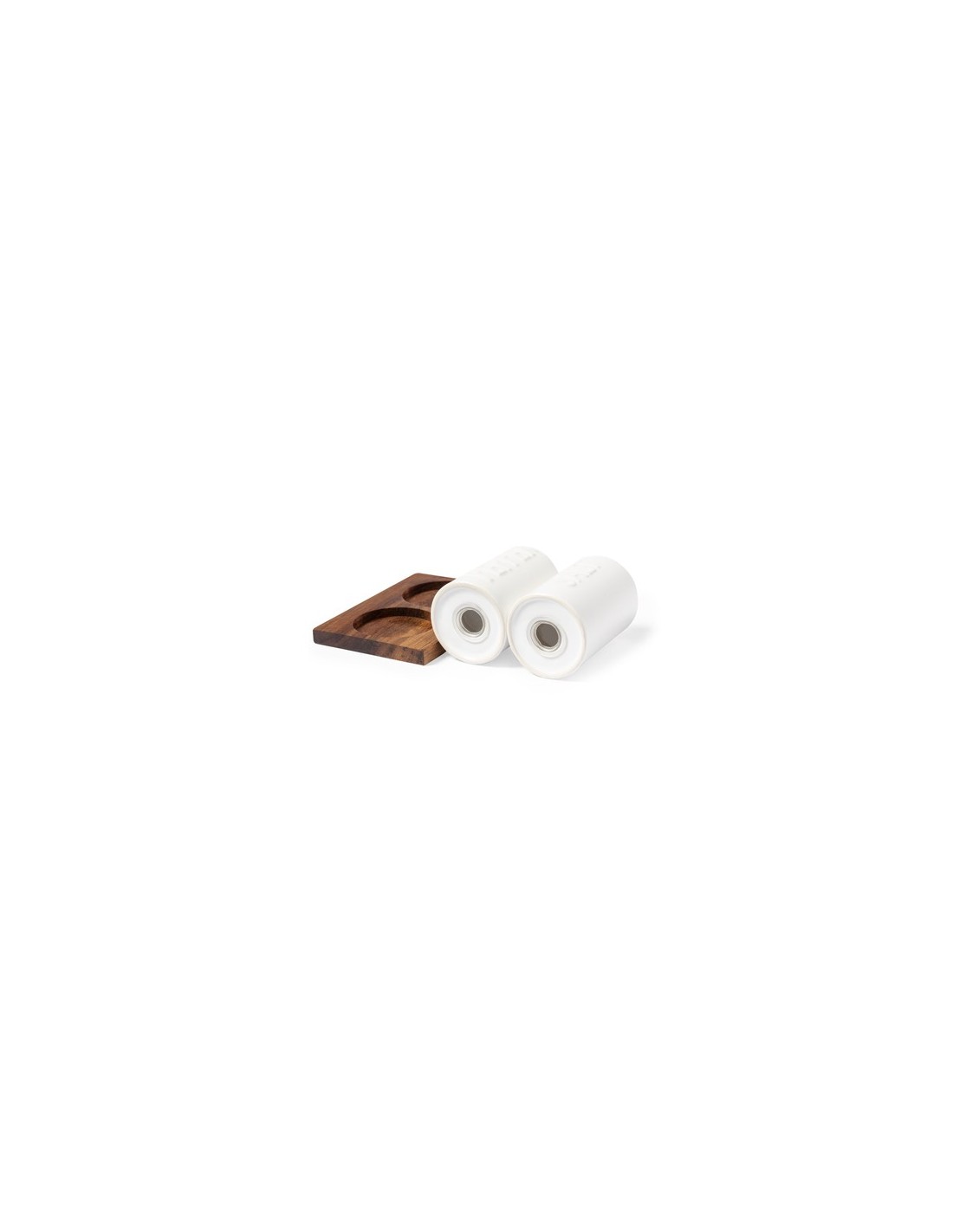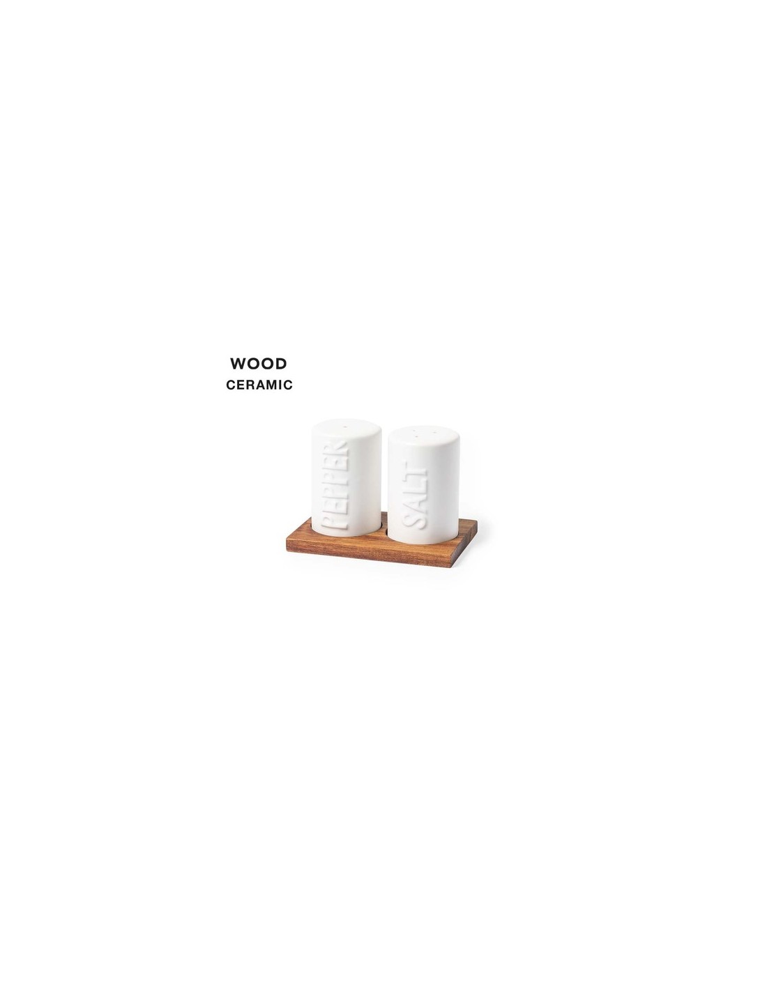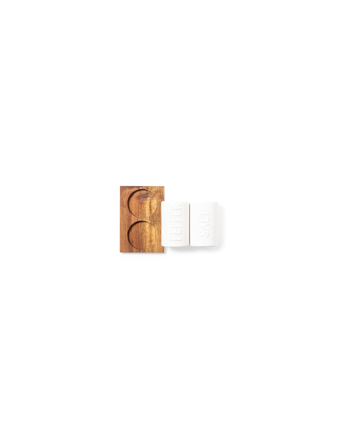 Set de salero y pimentero en blanco y fabricados en cerámica. Incluye base en madera natural de acacia, troquelada para encajar el salero y el pimentero. Presentación en caja individual de diseño kraft. 2 Piezas Composition : Cerámica/ Madera.