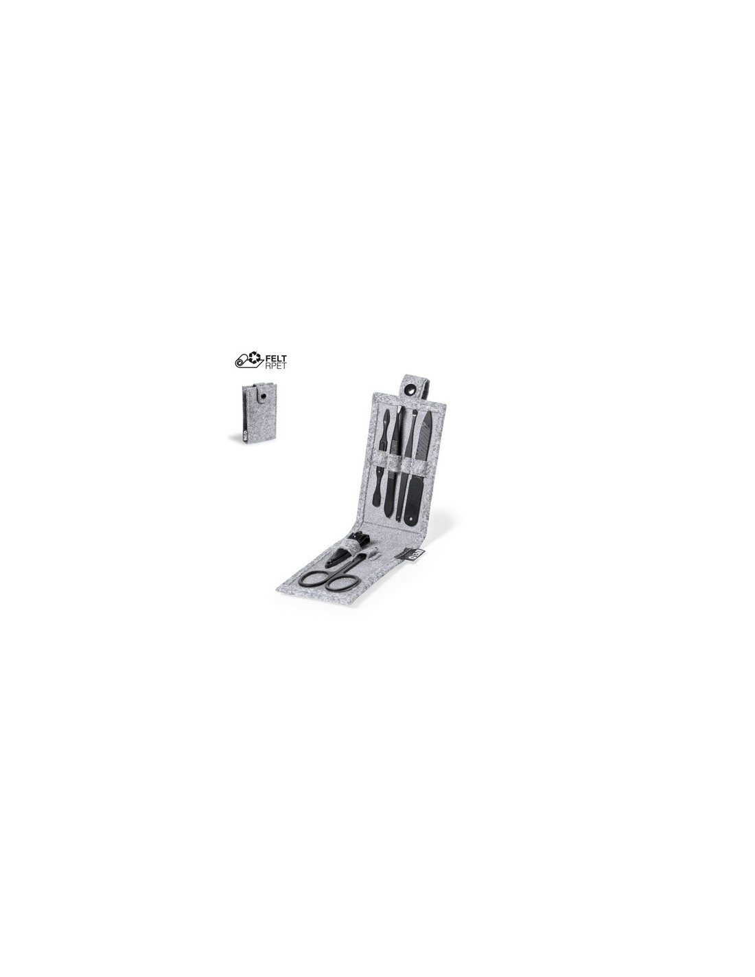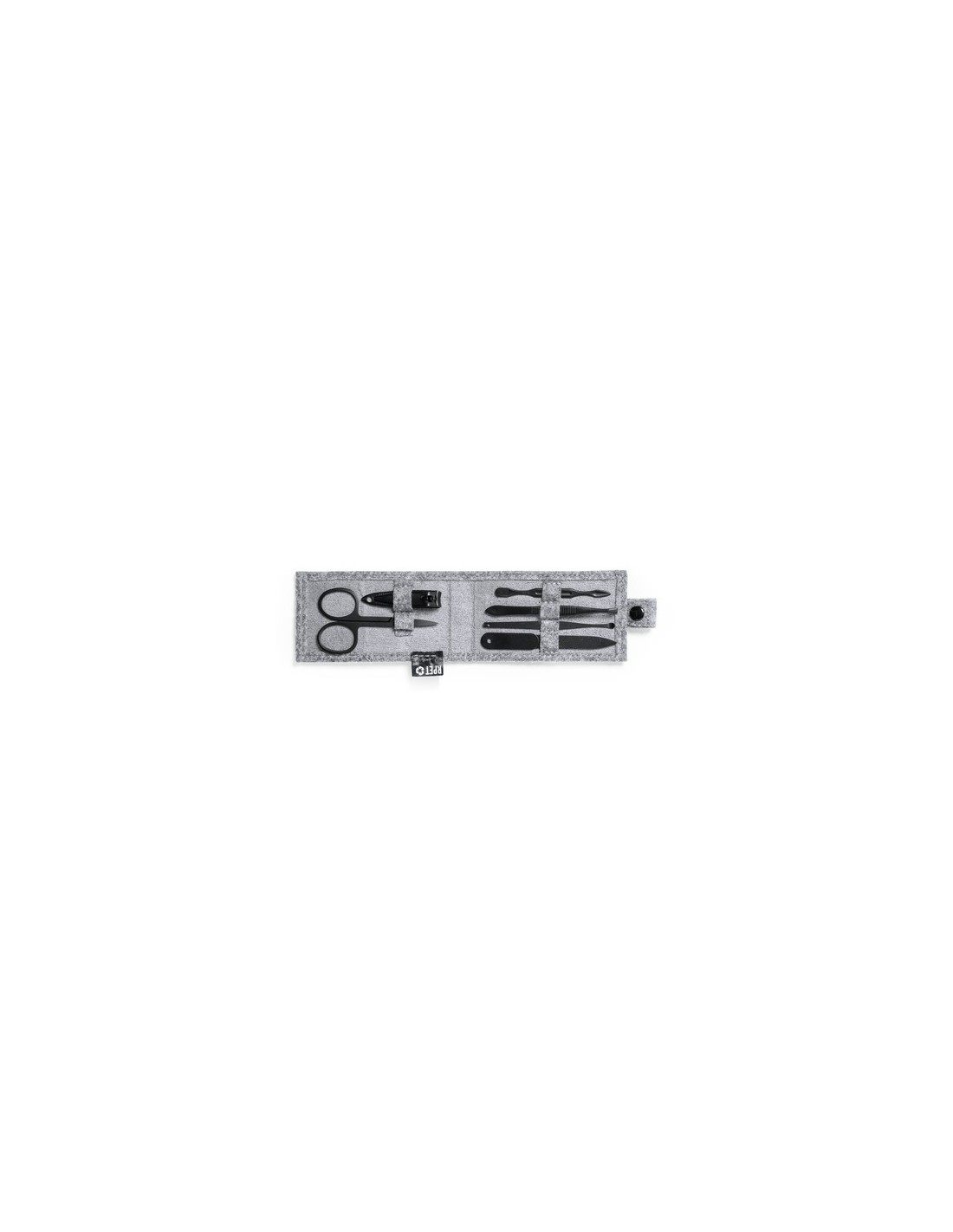 Set de manicura de 6 accesorios, con funda fabricada en resistente fieltro RPET, fruto de la combinación del proceso de reciclaje de materiales plásticos junto con la técnica milenaria de fabricación del fieltro, dando como resultado un material de eco-tendencia que, además de ser de origen reciclado, también se convierte en reciclable. Accesorios metálicos en acero inox de acabado negro: tijeras, pinzas, cortaúñas, lima y 2 quitacutículas. Con cierre de botón y etiqueta distintiva RPET en exterior. 6 Accesorios Composition : Fieltro RPET.