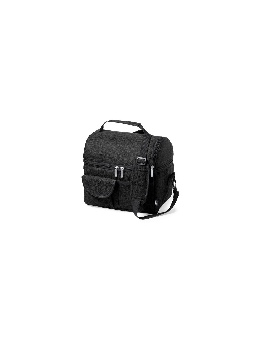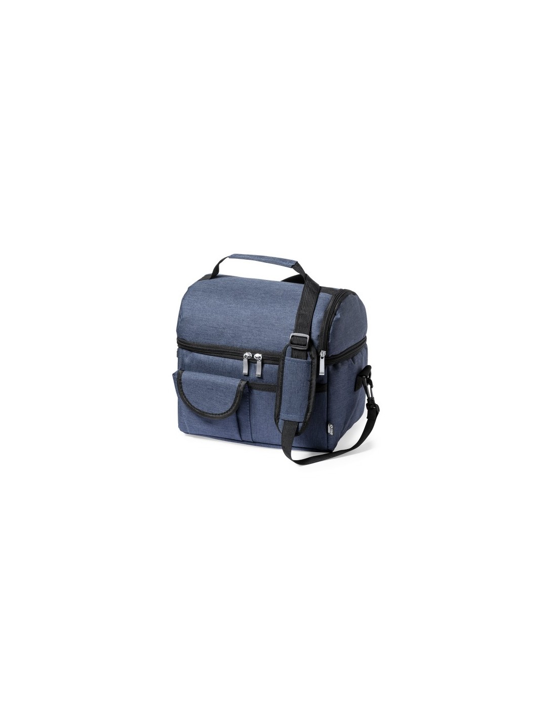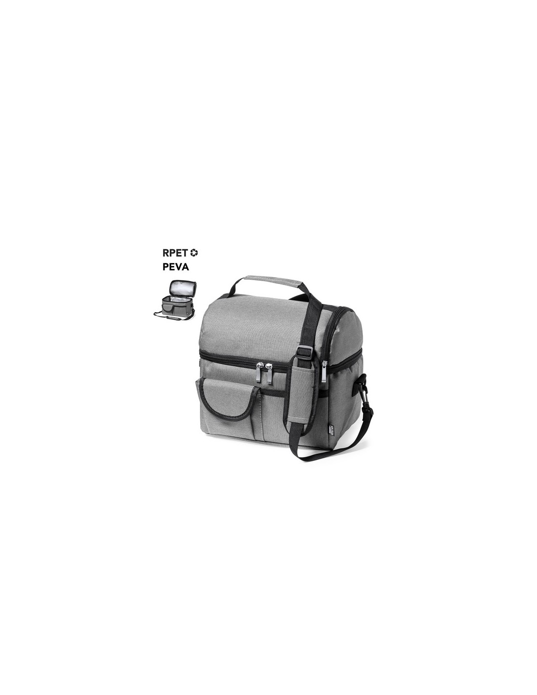 Nevera fabricada en resistente 600D RPET. Incluye 2 compartimentos independientes, con cierre de cremallera y tiradores metálicos. Interior isotermo en PEVA, con cinta bandolera ajustable y acolchado para hombro a juego. Bolsillo trasero de redecilla elástica y dos bolsillos frontales, uno de ellos con cierre de velcro. Etiqueta exterior con distintivo RPET, disponible en variada gama de colores. El material RPET se elabora a partir de plástico reciclado, para así fomentar la reutilización de residuos plásticos y ayudar a la sostenibilidad del planeta. Composition : Poliéster 600D RPET/ PEVA.