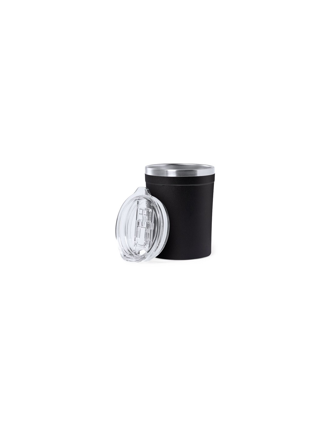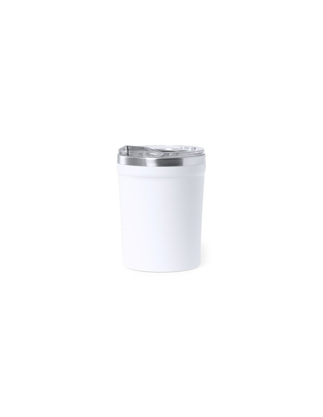 Vaso térmico de sobremesa faricado en acero inox de 350 ml de capacidad. Exterior en PP, con dosificador y abrefácil en tapa. Libre de BPA. Presentado en caja individual de diseño kraft. 330 ml Composition : Acero Inox/ PP.