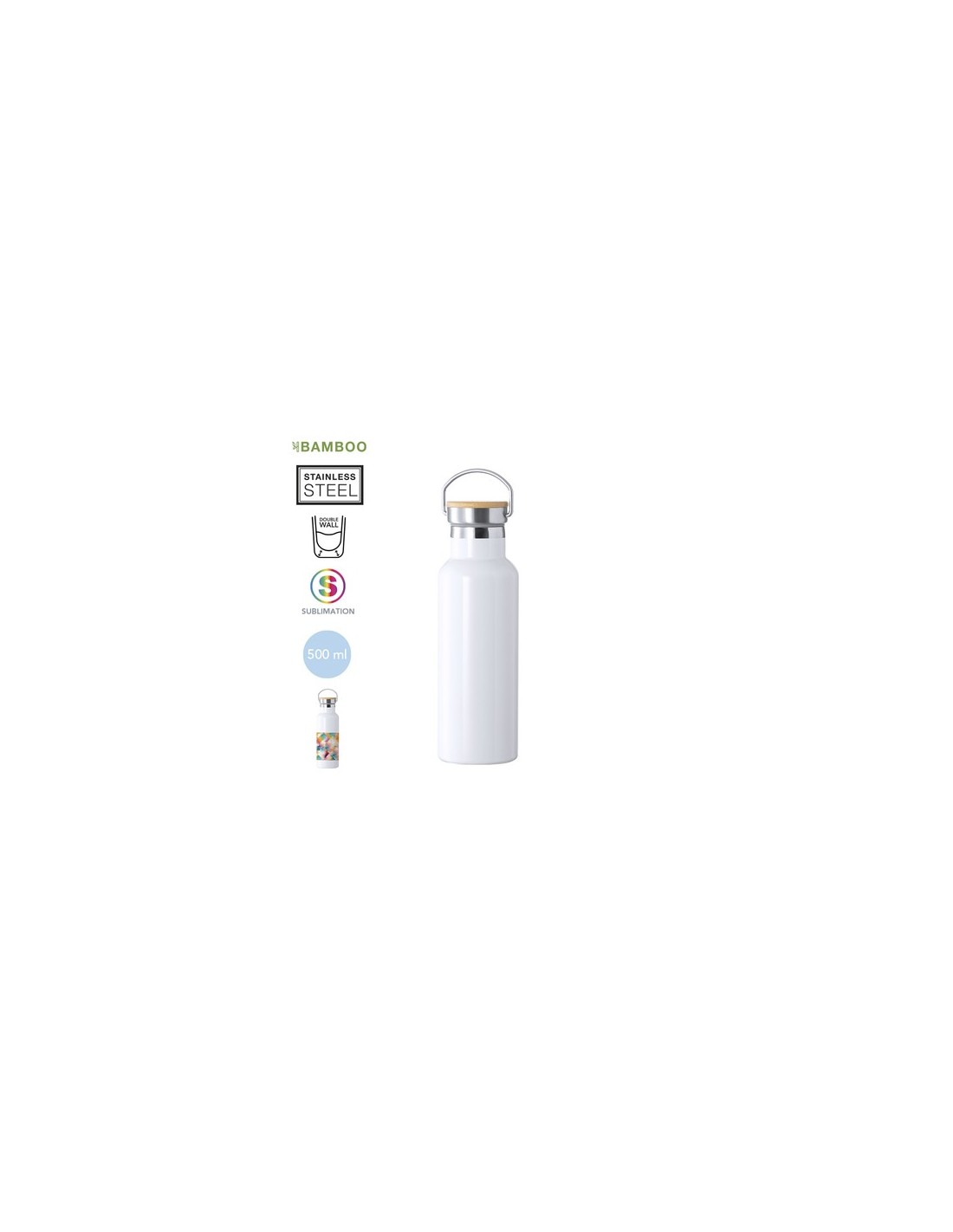 Bidón térmico de 500 ml de capacidad, fabricado en acero inox de doble pared y especialmente diseñado para marcaje en sublimación. De acabado blanco brillo y con original tapón a rosca en acero inox, con detalle de bambú y asa integrada. Libre de BPA y presentado en caja individual de diseño kraft.Disponible manual de instrucciones en español e inglés. 500 ml Composition : Acero Inox/ Bambú.