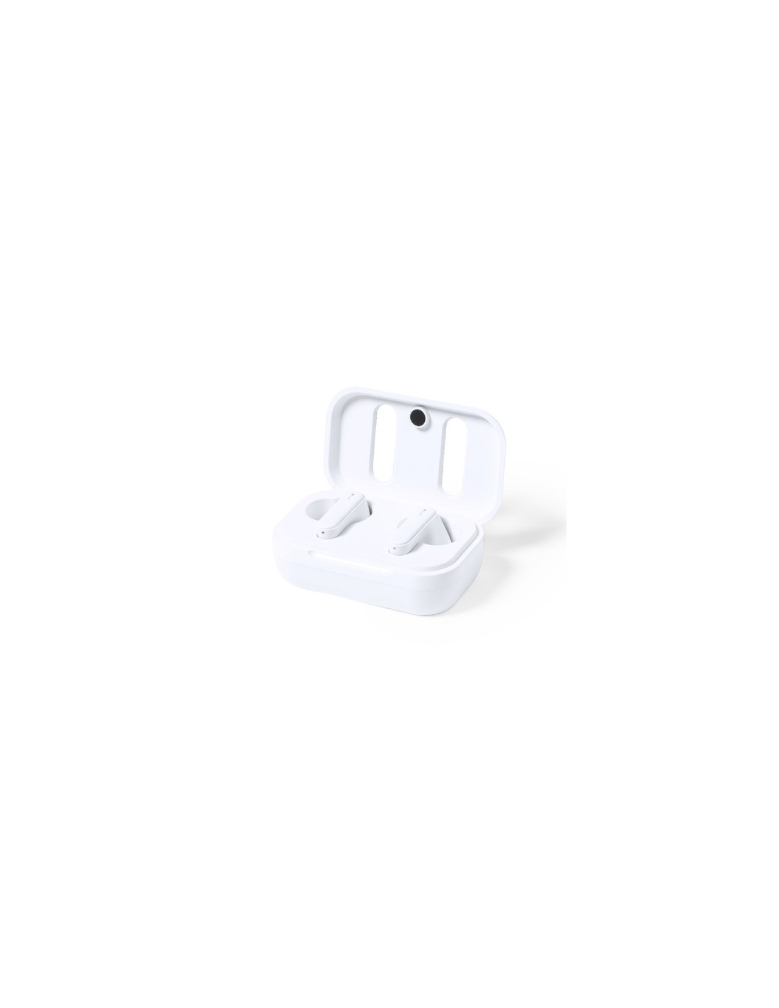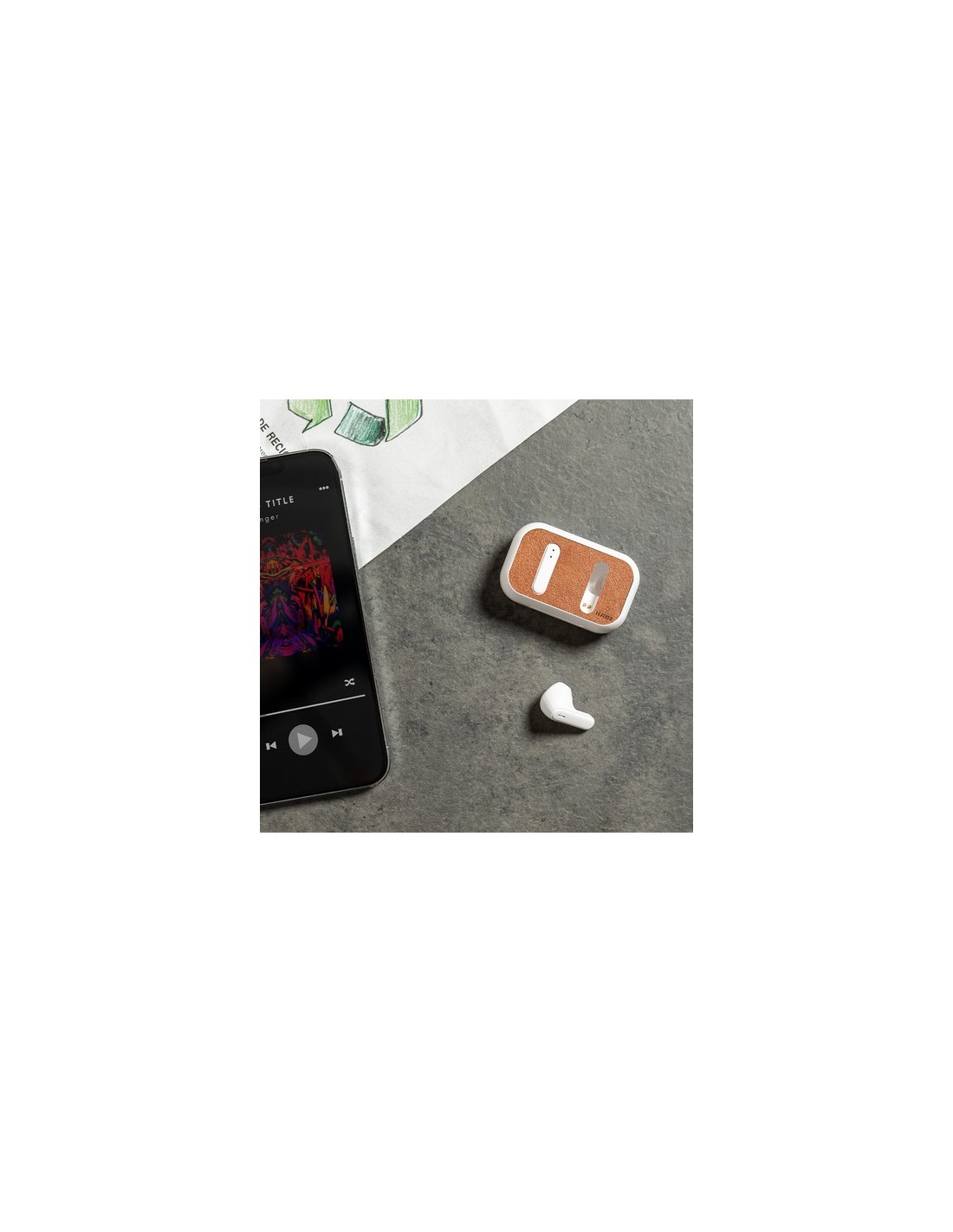Auriculares intraurales Bluetooth, fabricados en RABS y en elegante color blanco, con la tapa de la base de carga forrada en cuero reciclado.Conexión Bluetooth 5.1, función manos libres y batería de 30 mAh. De diseño ergonómico, incluyen botón de control táctil integrado en cada auricular y luz LED de estado de carga. Base de carga a juego, con batería de 300mAh. Incluye cable cargador Tipo C y manual de instrucciones en español e inglés. Presentado en caja individual de diseño kraft.El material RABS o ABS Reciclado y el cuero reciclado proceden del reciclado de artículos al final de su vida útil. Los materiales reciclados empleados incorporan la certificación RCS, que garantiza el origen reciclado de los mismos. Conexión Bluetooth. Batería 30 mAh/ Base Carga 300 mAh Composition : Cuero Reciclado/ ABS Reciclado.