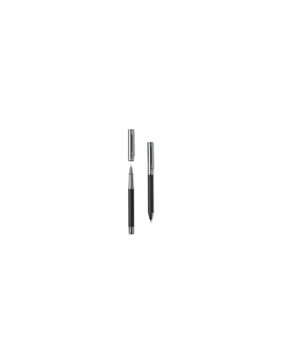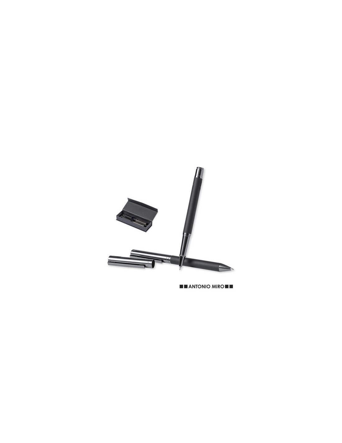Set de bolígrafo y roller de Antonio Miró. Incluye: Bolígrafo metálico con cuerpo en negro mate. Detalles y capucha en cromado con logotipo de la marca cartucho jumbo y en tinta azul.Roller metálico con cuerpo en negro mate. Detalles y capucha en cromado con logotipo de la marca. Cartucho jumbo y en tinta azul.Presentado en elegante y resistente estuche individual negro con logotipo Antonio Miró, cierre magnético y funda de protección a juego. Bolígrafo y Roller. Carga Jumbo Composition : Metal.