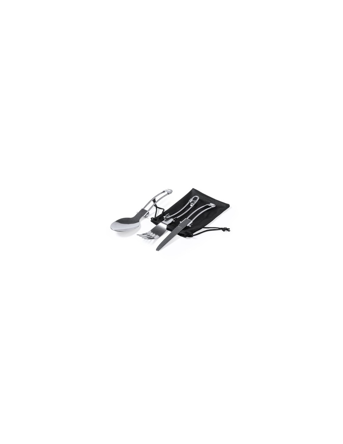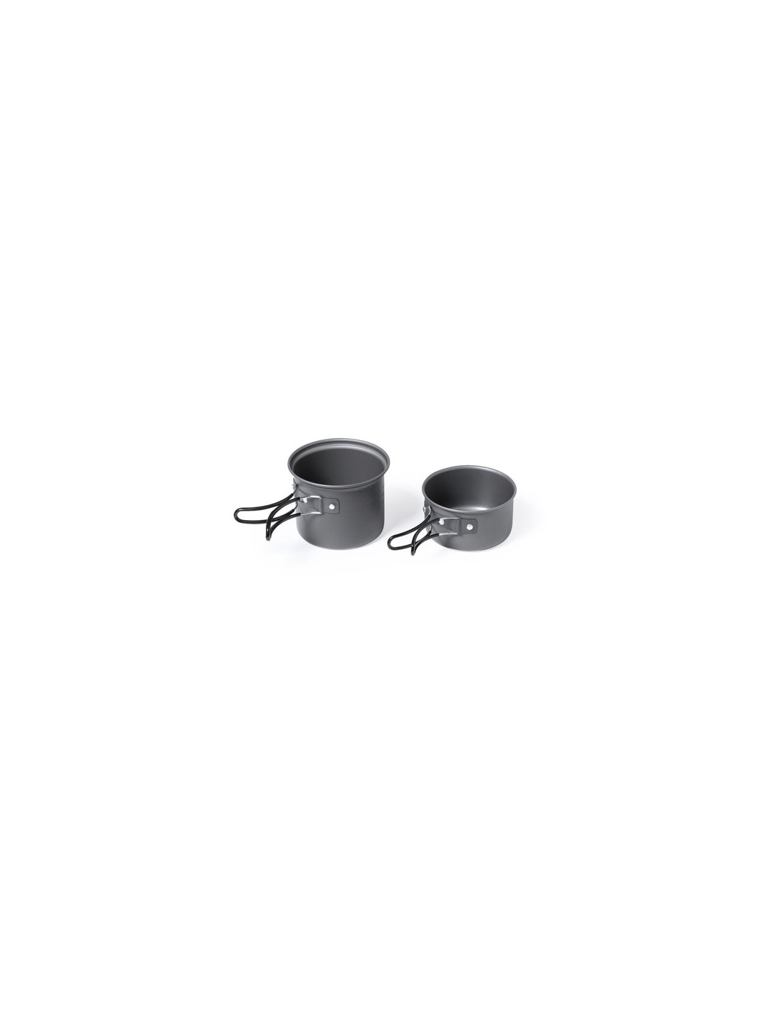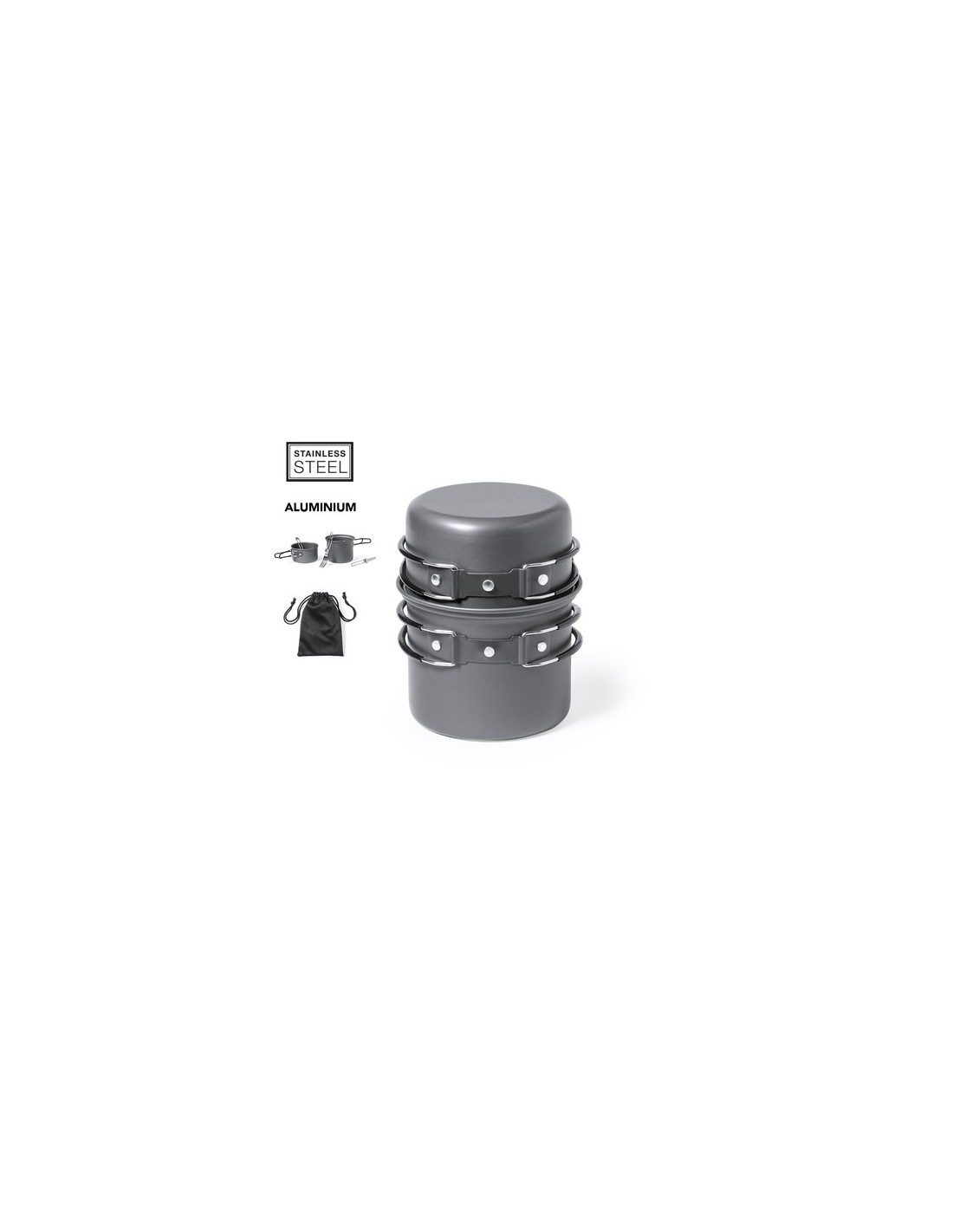 Completo set de menaje para camping de tamaño ultra compacto. Presentado en resistente funda de RPET con cierre de cordón, accesorio de ajuste y etiqueta exterior con distintivo RPET. Contenido:1 olla de aluminio acabado gris mate. 800 ml de capacidad 13 cm de diámetro x 10 cm de alto. Asas plegables con protección antiquemaduras.1 olla de aluminio acabado gris mate. 600 ml de capacidad 12 cm de diámetro x 6,5 cm de alto. Asas plegables con protección antiquemaduras.Cuchara, cuchillo y tenedor plegables fabricados en acero inox. Con mango troquelado y cierres de seguridad. Presentados en funda individual de RPET con cordones de cierre. El material RPET de las fundas se elabora a partir de plástico reciclado, para así fomentar la reutilización de residuos plásticos y ayudar a la sostenibilidad del planeta. 5 Accesorios. Funda Poliéster RPET Composition : Acero Inox/ Aluminio.