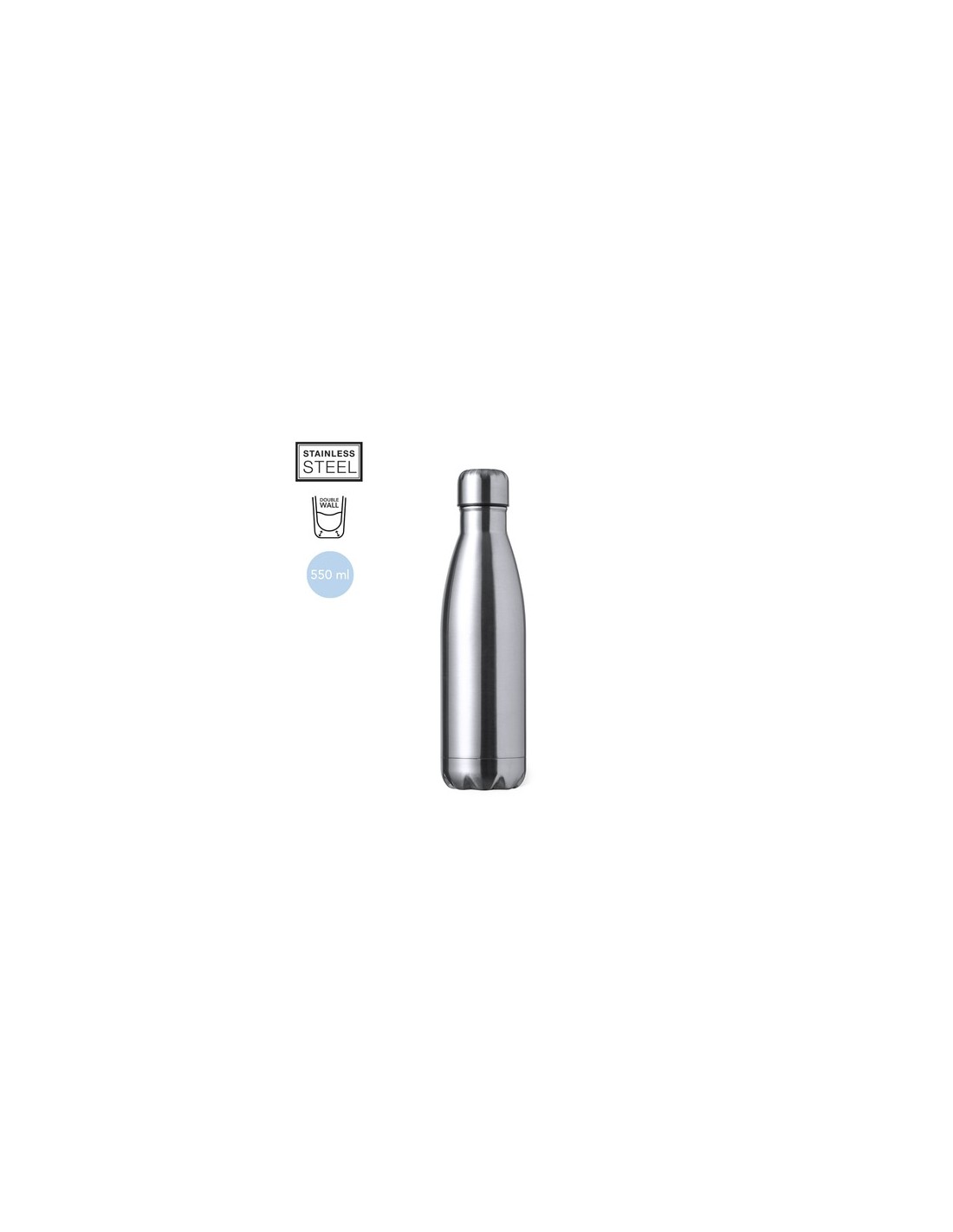 Bidón térmico de 550 ml de capacidad, fabricado en acero inox de doble pared. Con tapón a rosca, libre de BPA y disponible en variada gama de colores satinados. Presentado en caja individual de diseño kraft.Disponible manual de instrucciones en español e inglés. 550 ml Composition : Acero Inox.