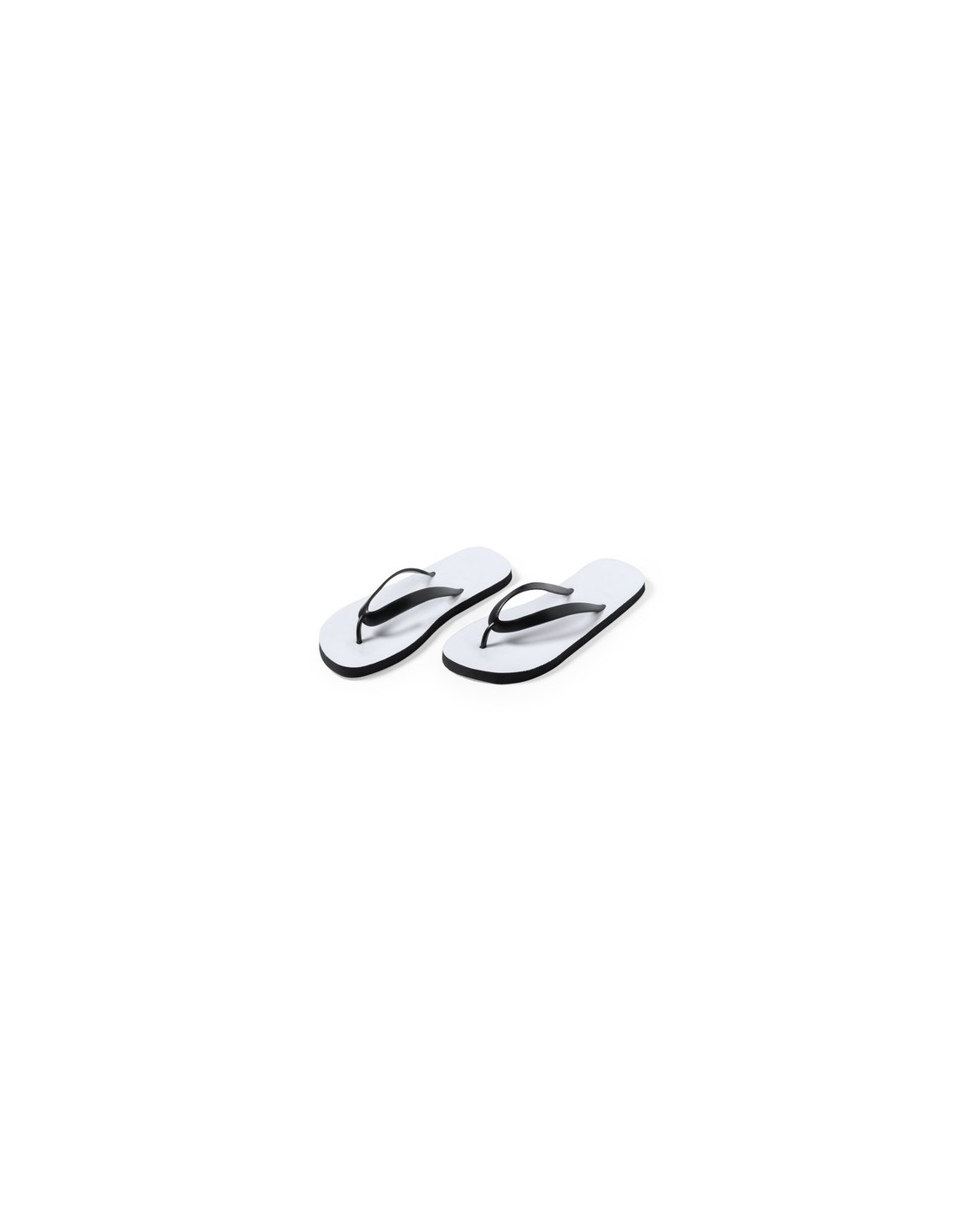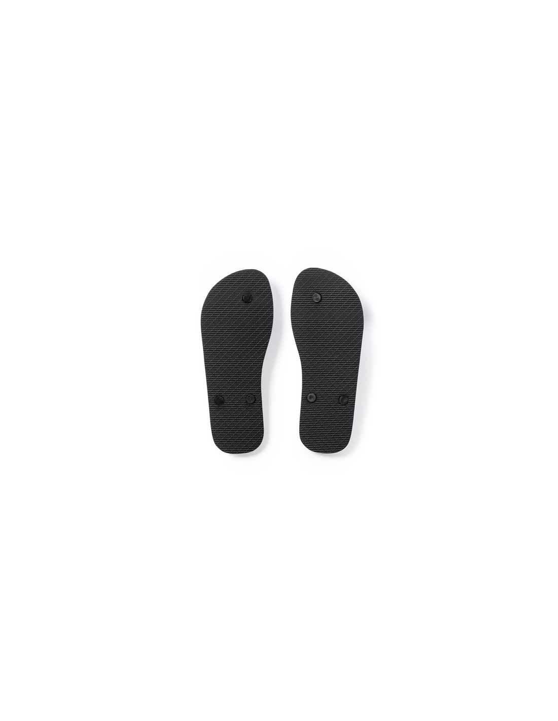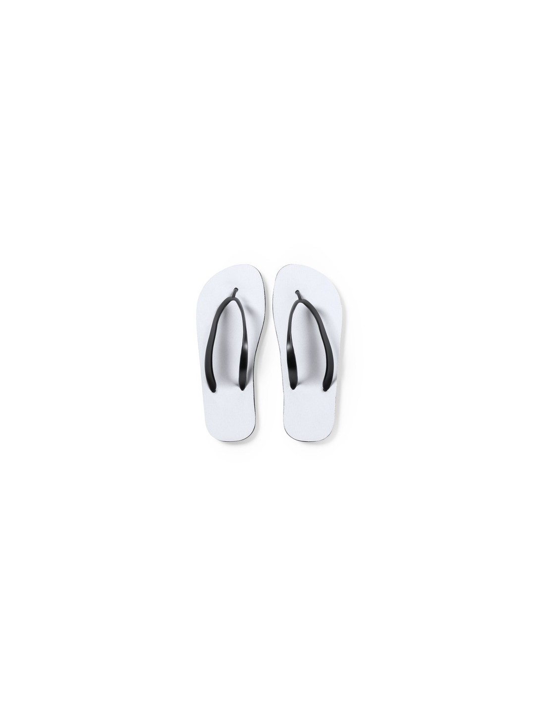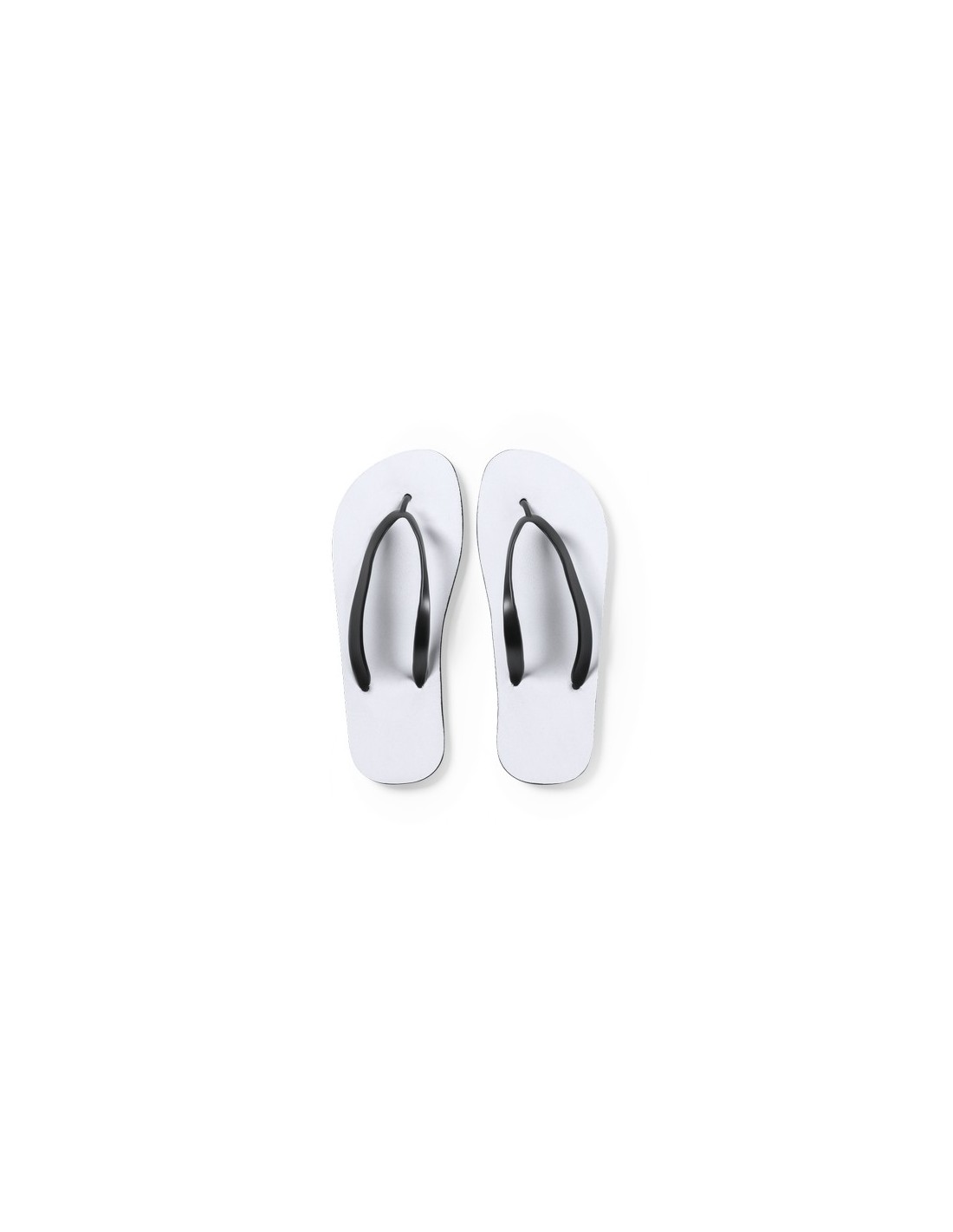 Par de chanclas con suela 100% personalizable y especialmente diseñadas para marcaje en sublimación. Con resistente suela de EVA, tiras de PVC en color negro y disponibles en dos tallas: 36-38 y 42-44. Set compuesto de plancha de EVA troquelada para personalización. Tallas: 36-38, 42-44 Composition : EVA/ PVC/ Poliéster.