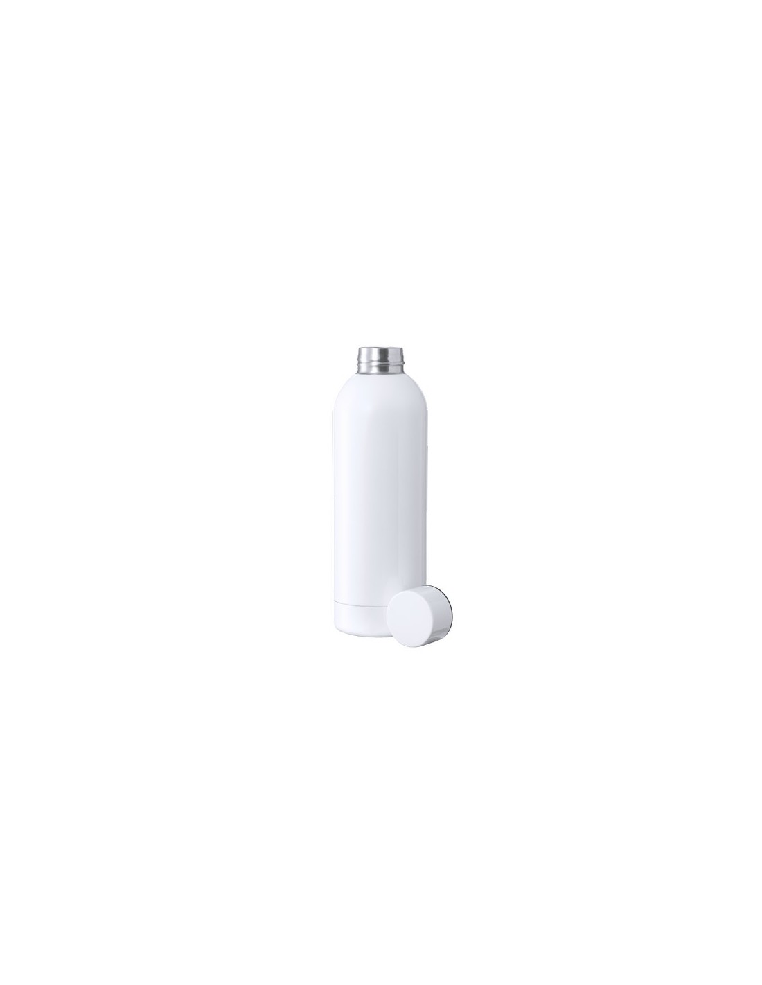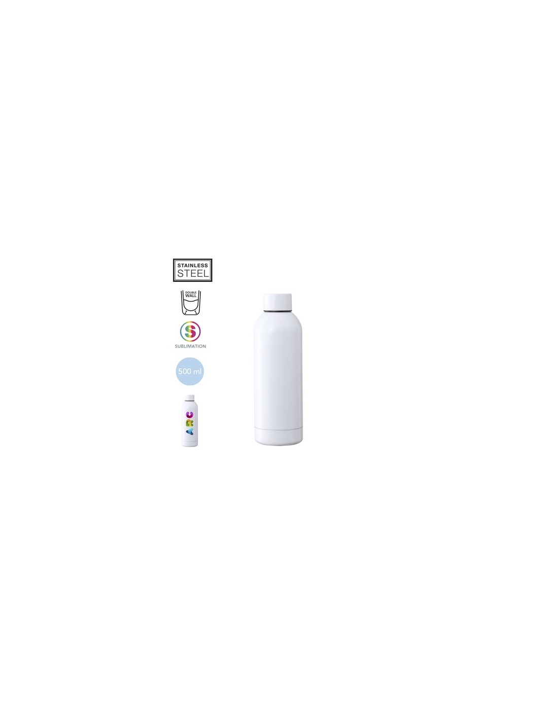 Bidón térmico de 500 ml de capacidad, fabricado en acero inox de doble pared y especialmente diseñado para marcaje en sublimación. De acabado blanco brillo y con tapón a rosca a juego, libre de BPA. Presentado en caja individual de diseño kraft. Disponible manual de instrucciones en español e inglés. 500 ml Composition : Acero Inox.