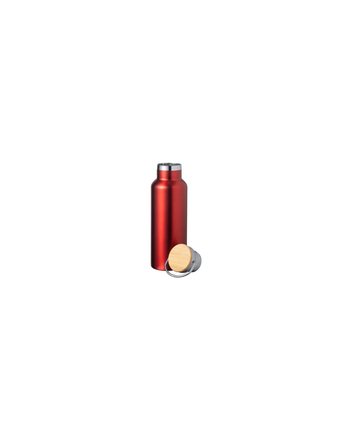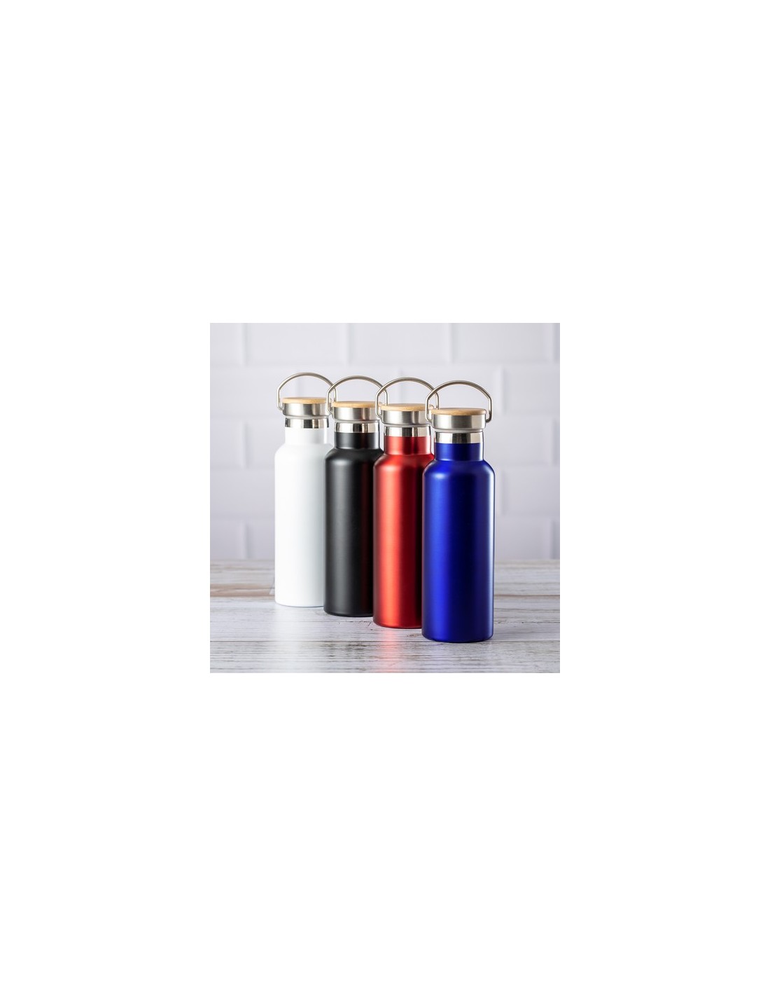 Bidón térmico de 500 ml de capacidad, fabricado en acero inox de doble pared. Incluye original tapón a rosca en acero inox, con detalle de bambú y asa integrada. Disponible en variada gama de colores y presentado en caja individual de diseño kraft. 500 ml Composition : Acero Inox/ Bambú.