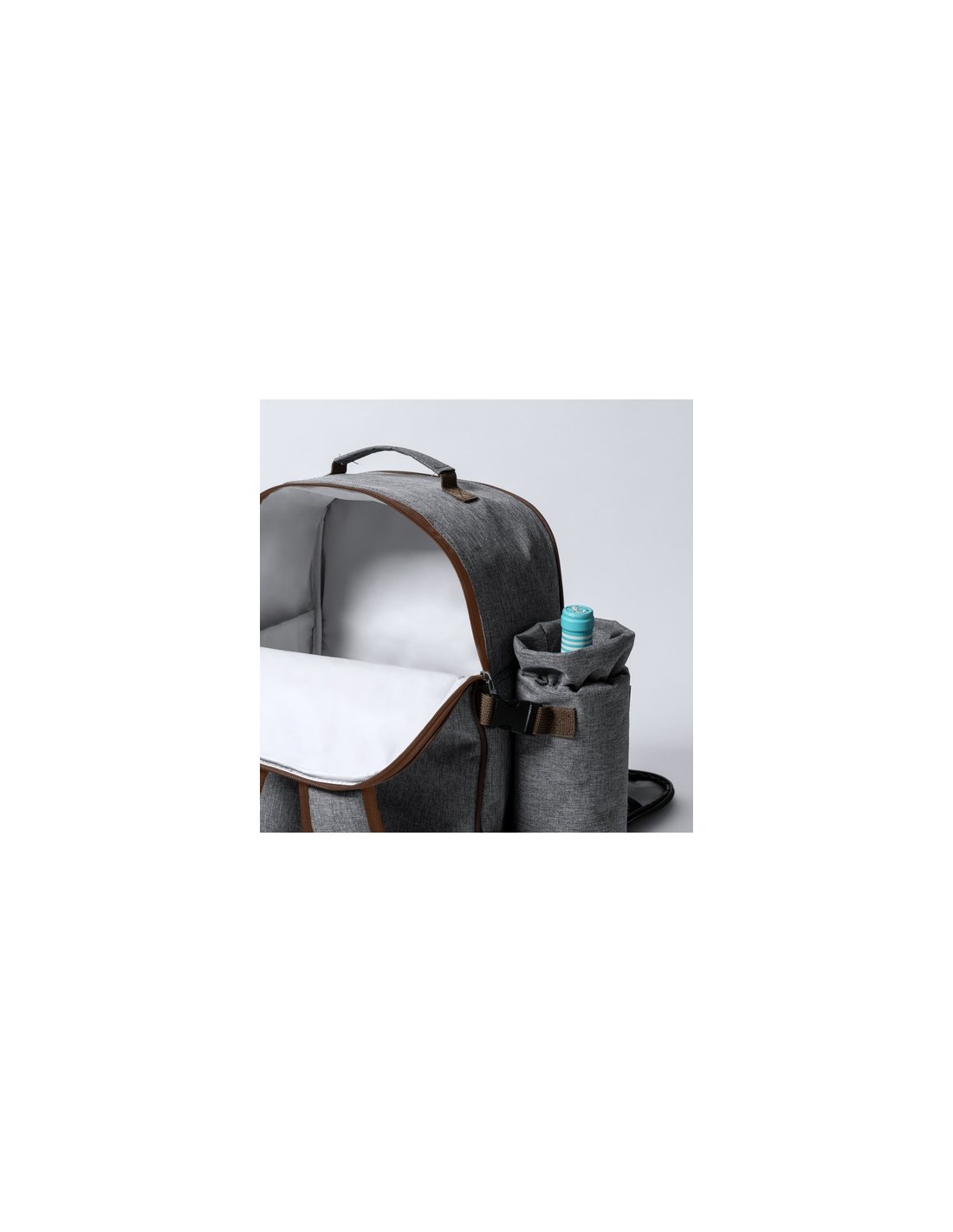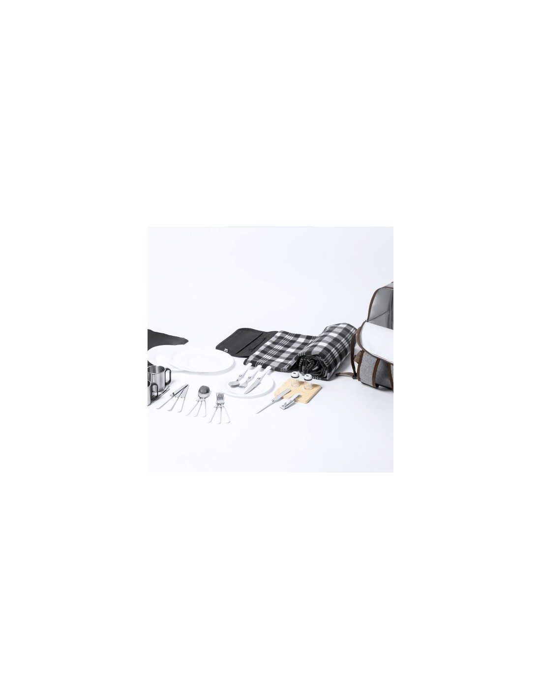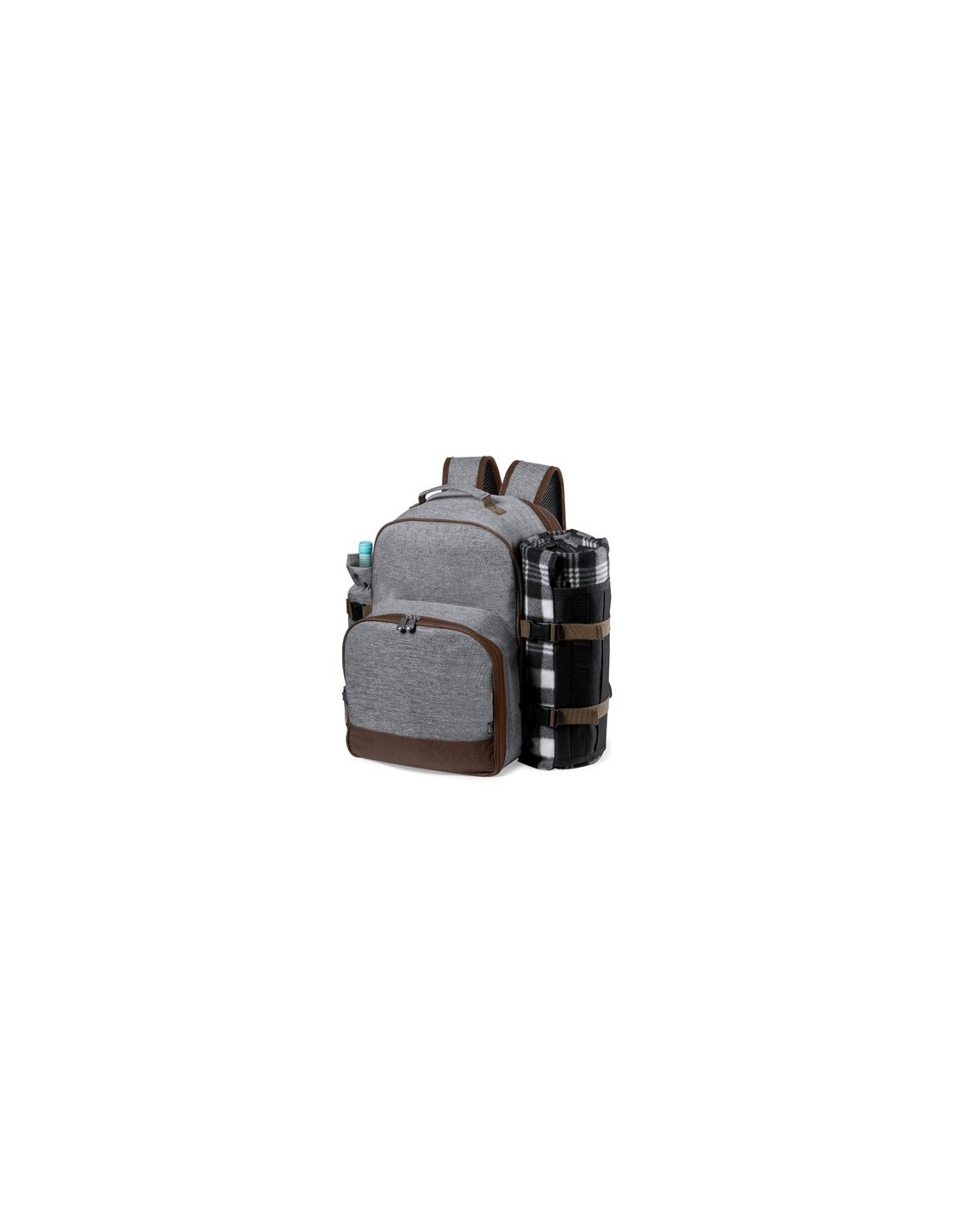 Mochila nevera para picnic de 4 servicios y con multitud de complementos, fabricada en resistente 600D RPET. Acabado en color gris, con detalles en marrón asa de transporte y cintas para hombros acolchadas y ajustables. Compartimento principal con cierre de cremallera y tiradores metálicos. Interior isotermo en PEVA y etiqueta exterior con distintivo RPET. Incluye: 4 tazas en acero inox. 4 cucharas, 4 cuchillos y 4 tenedores en acero inox con mango en PP blanco. 1 cuchillo de untar en acero inox con mango en PP blanco 4 platos en PP blanco de 23 cm de diámetro. 4 servilletas en tela de 30 x 30 cm. Con diseño retro en patrón a cuadros y en combinación tonos negros, grises y blancos. Sacacorchos abridor en acero inox con mango en PP blanco. Salero y pimentero transparentes con tapón en PP blanco. Tabla de corte y presentación en madera, tamaño 15x15 cm. Bolsa plegable interior. Botellero térmico a juego en lateral izquierdo, fabricado en RPET y extraíble mediante cierres de hebilla. Manta de picnic de calidad premium lateral derecho, con cierres ajustables de hebilla. Medidas 120x150cm, con lado para sentarse en patrón tartán bicolor de agradable tacto. Base aislante en resistente PEVA. De fácil plegado y de tamaño compacto, incluye asa de transporte y solapa con cierre de velcro. El material RPET se elabora a partir de plástico reciclado, para así fomentar la reutilización de residuos plásticos y ayudar a la sostenibilidad del planeta. 32 Piezas. 4 Servicios. Parte Trasera y Cintas Acolchadas. Manta Picnic Poliéster 600D RPET 160 g/ m2 Incluida Composition : Poliéster RPET/ PEVA.