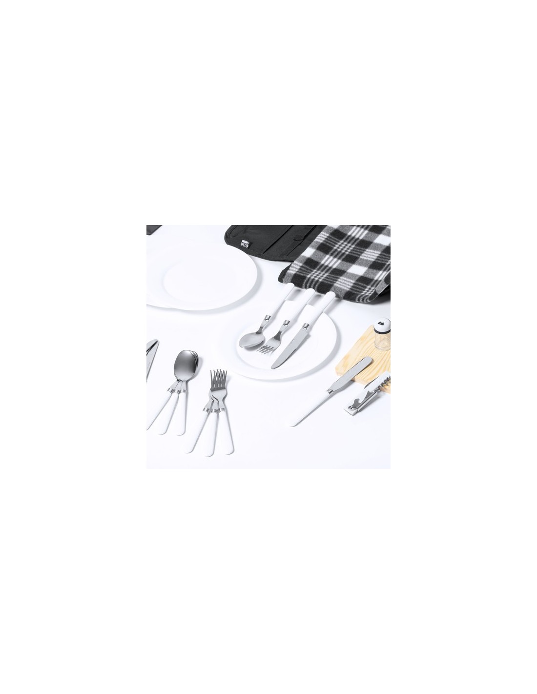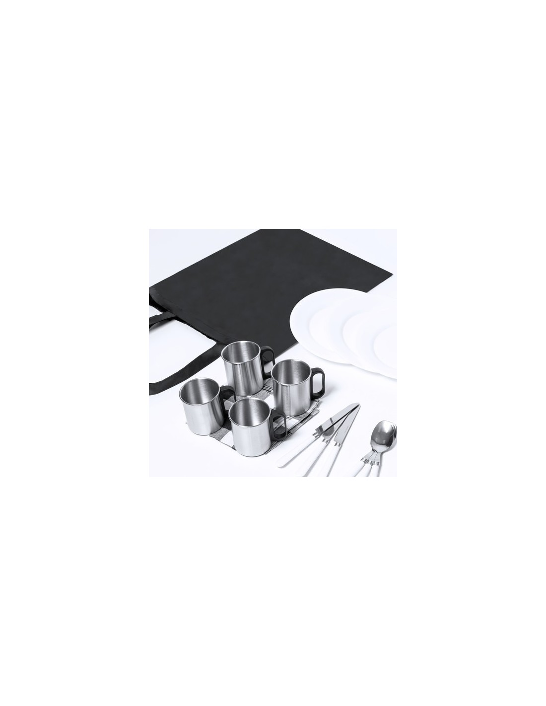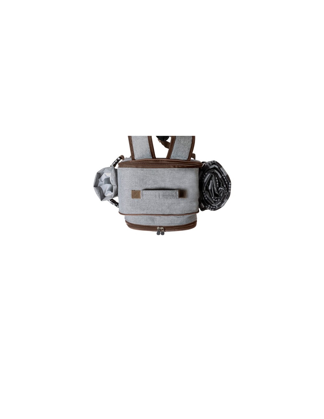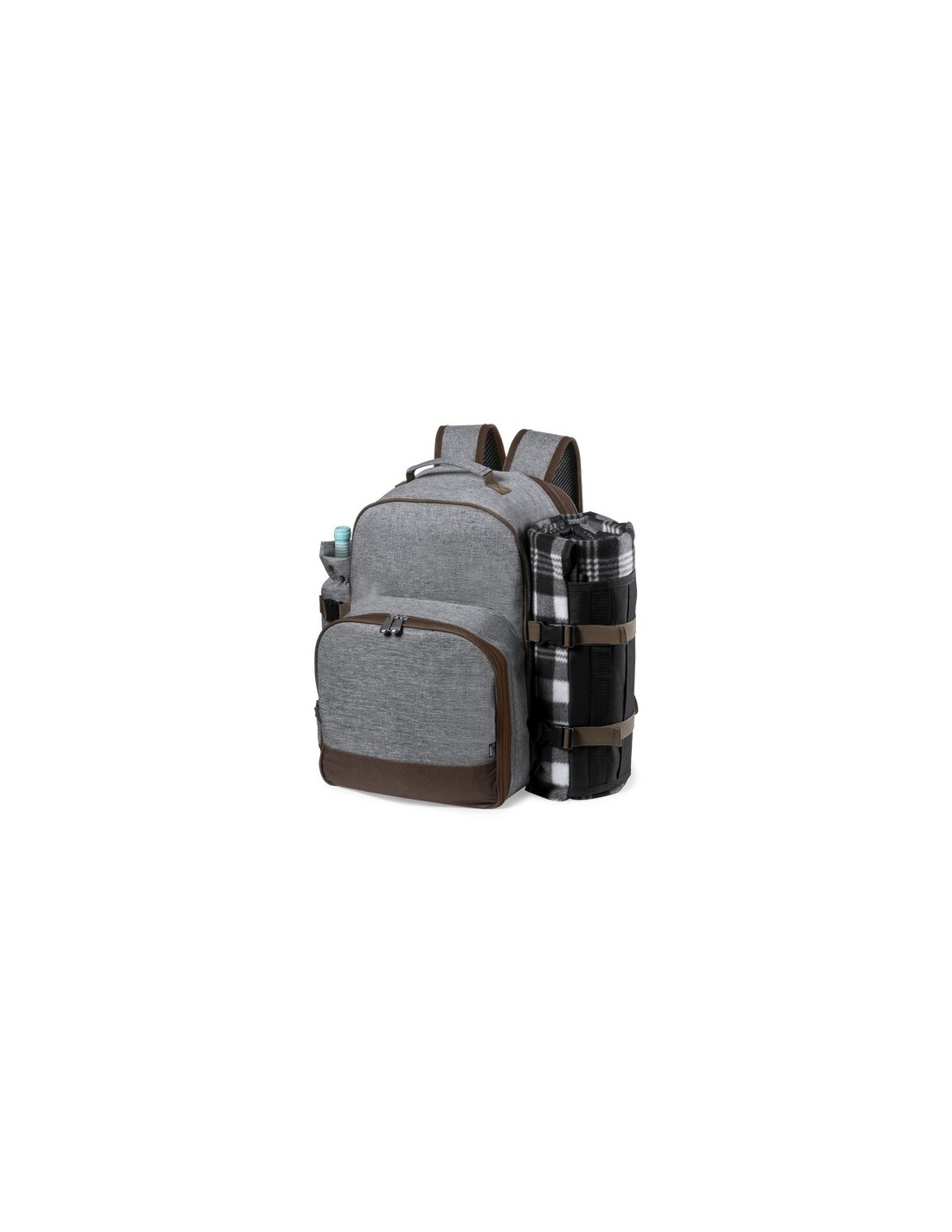 Mochila nevera para picnic de 4 servicios y con multitud de complementos, fabricada en resistente 600D RPET. Acabado en color gris, con detalles en marrón asa de transporte y cintas para hombros acolchadas y ajustables. Compartimento principal con cierre de cremallera y tiradores metálicos. Interior isotermo en PEVA y etiqueta exterior con distintivo RPET. Incluye: 4 tazas en acero inox. 4 cucharas, 4 cuchillos y 4 tenedores en acero inox con mango en PP blanco. 1 cuchillo de untar en acero inox con mango en PP blanco 4 platos en PP blanco de 23 cm de diámetro. 4 servilletas en tela de 30 x 30 cm. Con diseño retro en patrón a cuadros y en combinación tonos negros, grises y blancos. Sacacorchos abridor en acero inox con mango en PP blanco. Salero y pimentero transparentes con tapón en PP blanco. Tabla de corte y presentación en madera, tamaño 15x15 cm. Bolsa plegable interior. Botellero térmico a juego en lateral izquierdo, fabricado en RPET y extraíble mediante cierres de hebilla. Manta de picnic de calidad premium lateral derecho, con cierres ajustables de hebilla. Medidas 120x150cm, con lado para sentarse en patrón tartán bicolor de agradable tacto. Base aislante en resistente PEVA. De fácil plegado y de tamaño compacto, incluye asa de transporte y solapa con cierre de velcro. El material RPET se elabora a partir de plástico reciclado, para así fomentar la reutilización de residuos plásticos y ayudar a la sostenibilidad del planeta. 32 Piezas. 4 Servicios. Parte Trasera y Cintas Acolchadas. Manta Picnic Poliéster 600D RPET 160 g/ m2 Incluida Composition : Poliéster RPET/ PEVA.