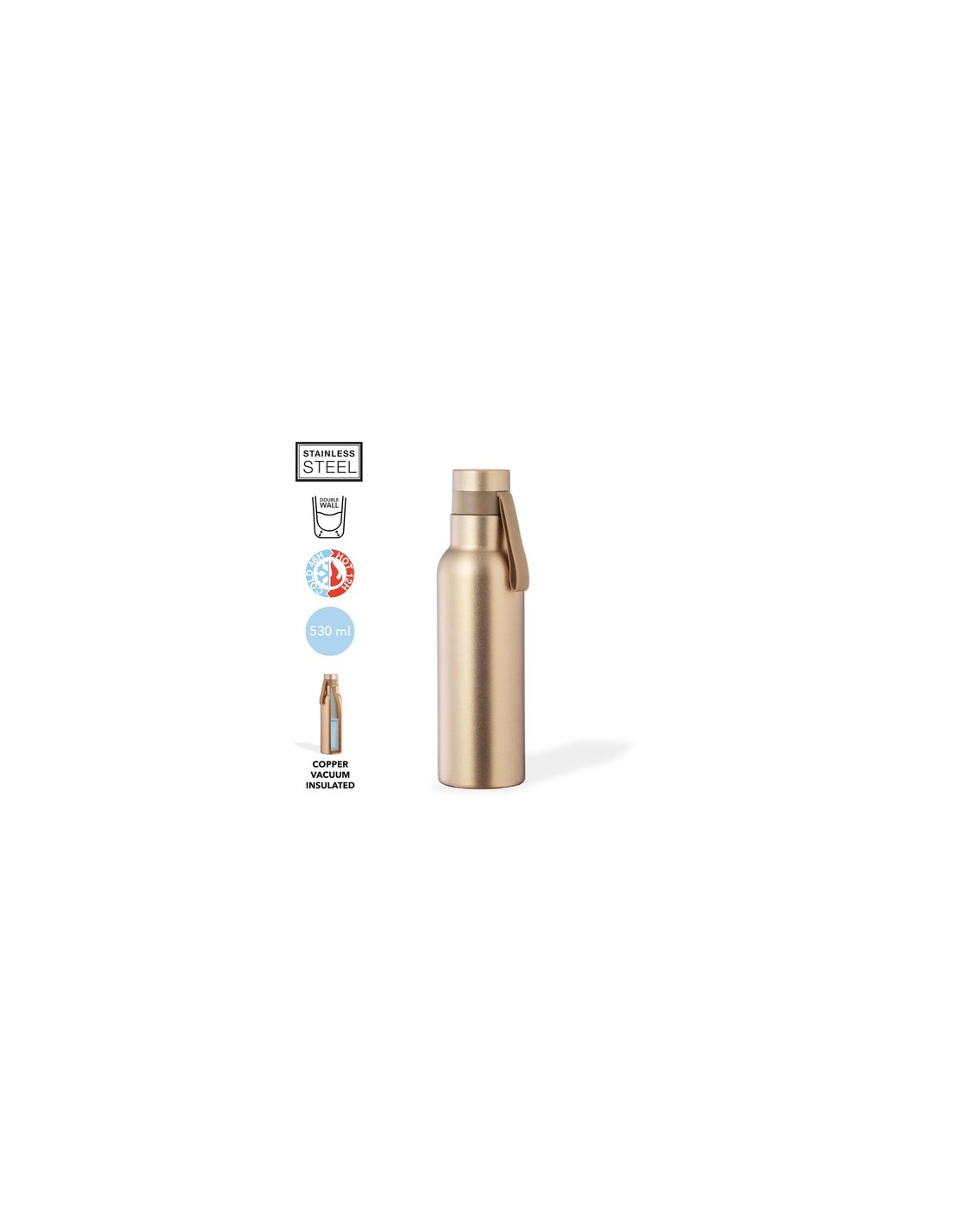 Bidón térmico de 530 ml de capacidad, fabricado en acero inox de doble pared. Con aislamiento de cobre al vacío, que permite mantener el calor y el frío durante más tiempo, llegando a las 12 y 48 horas respectivamente. Tapón a rosca con asa integrada a juego, libre de BPA. Disponible en variada gama de colores metalizados y presentado en caja individual de diseño kraft. 530 ml. Aislamiento de Cobre al Vacío Composition : Acero Inox.