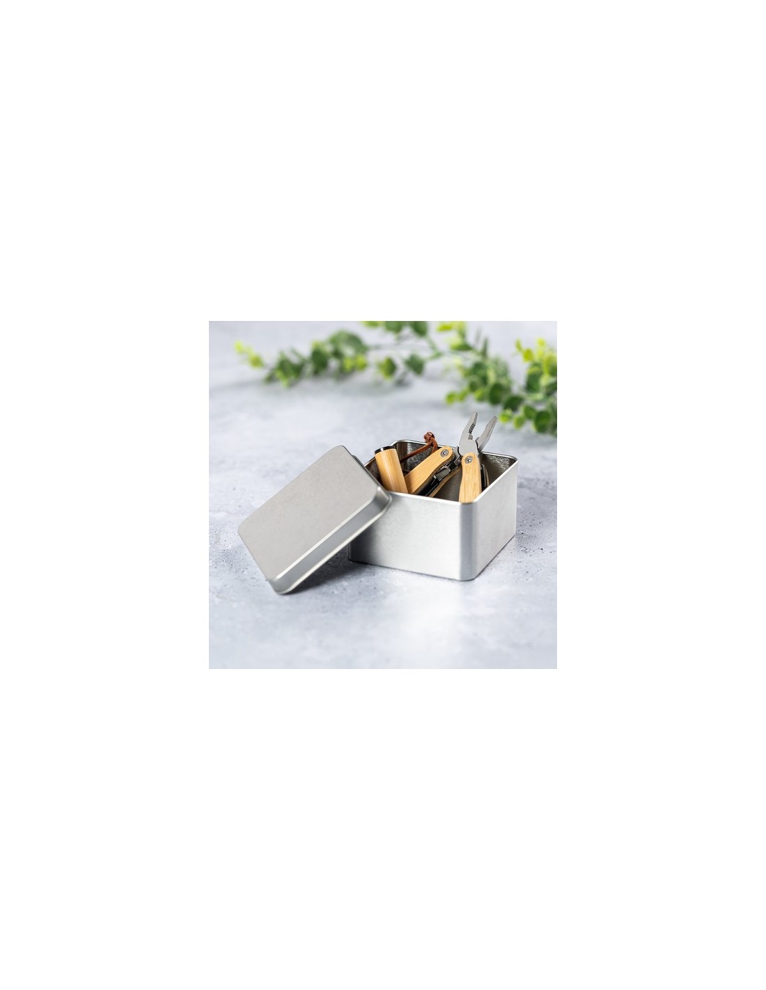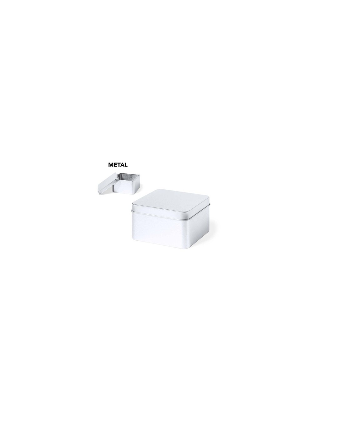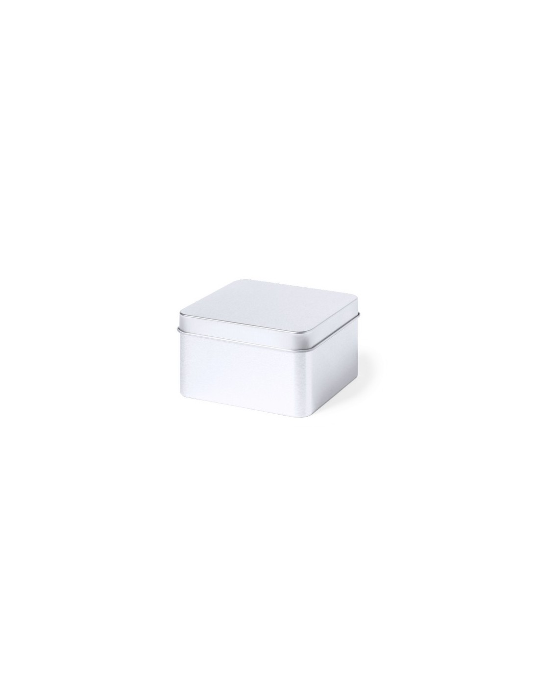 Caja de presentación formato cuadrado, fabricada en resistente metal de acabado plateado y con tapa a juego. Composition : Metal.
