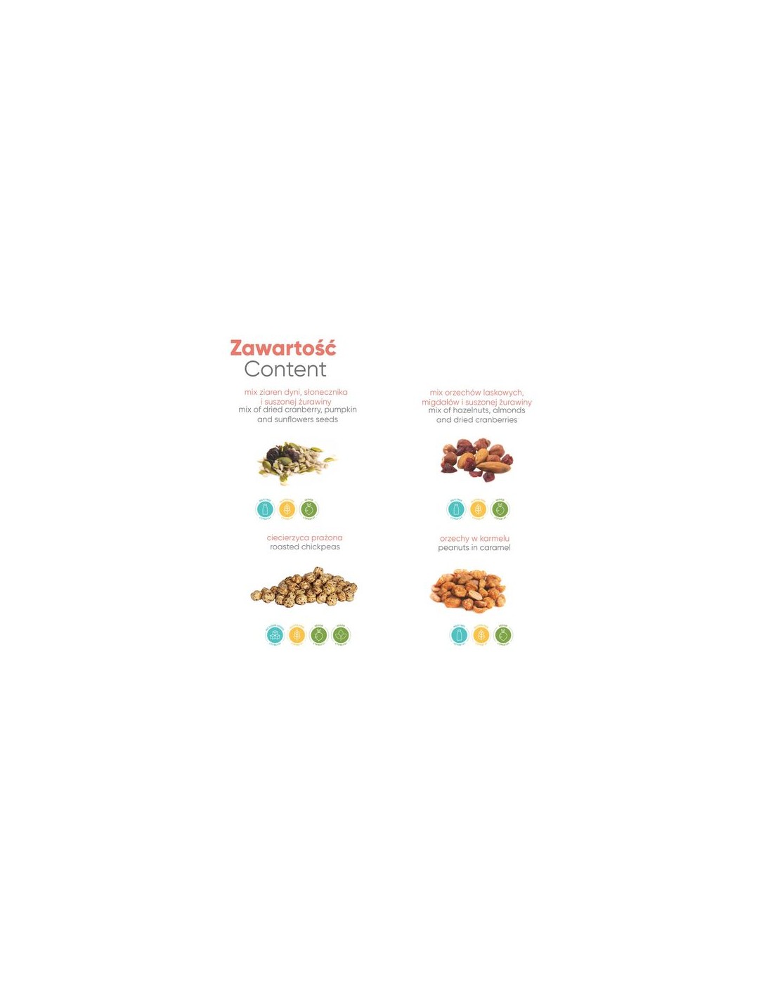 contenido : mezcla de semillas de calabaza, graines de toronesol y arándanos secas (total 20 g), o mezcla de avellanas, almendras y arándanos secas (total 25 g), o nueces au caramel 25 g, o pois chiches rôtis 25 g.Opciones de producto : etiqueta blanca o kraft.Inforomación adicional : Envase de PLA 100% compostable, envasado biodégradable a 100%, etiqueta en papel blanco de serie, papel kraft elección opcional.Dimensiones : 70 x 70 x 28 mm.Cantidad Mínimo : 250 piezas.Fecha de caducidad mínima : 6 meses.Tipo de impresión : banner – impresión digital.
