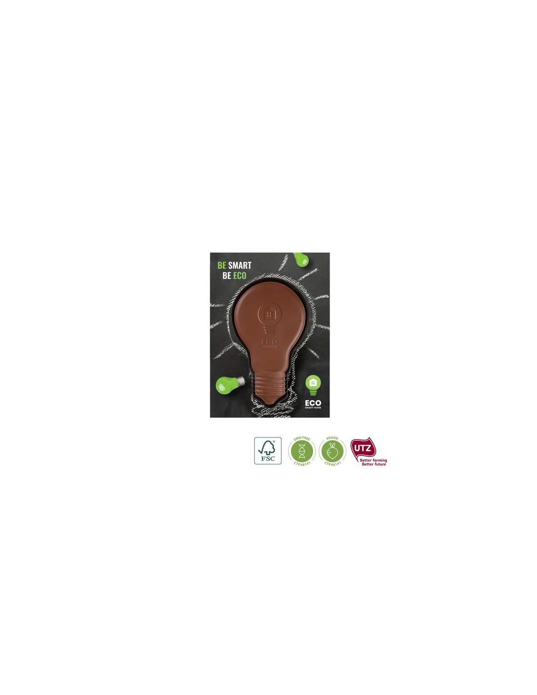 contenido : forma de chocolate 65 g.Saboro : chocolate con leche 33% cacao, chocolate blanco 36% manteca de cacao, chocolate negro 54% cacao, chocolate negro 72% cacao, chocolate rubí 47% cacao, chocolate Caramel Gold 40% cacao,.Opciones de producto : papel blanco o kraft.Inforomación adicional : moldeado en R-PET (PET reciclado), papel blanco de serie, papel kraft elección opcional, posibilidad de personalizar el envasado y el chocolate (gofrado sobre el chocolate).Dimensiones : 182 x 132 x 15 mm.Cantidad Mínimo : 100 ejemplares.Fecha de caducidad mínima : 8 meses.