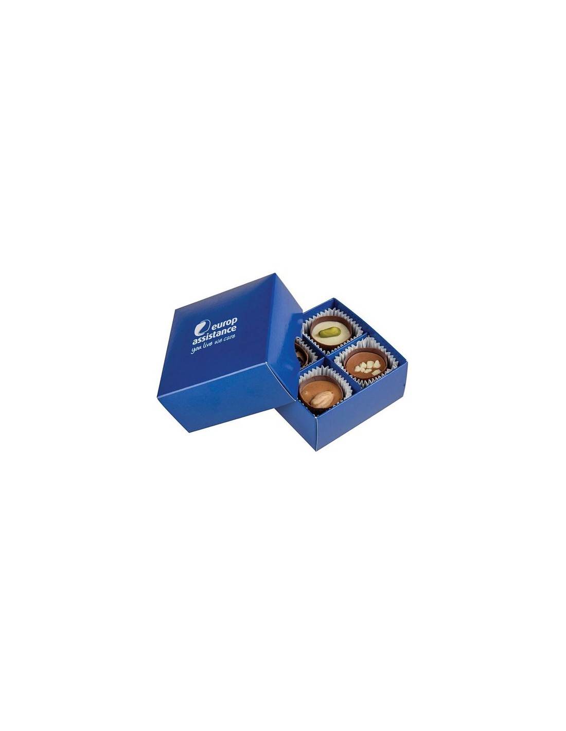 contenido : SURTIDO de 4 chocolates praliné belgas Noble chocolates (48 g en total).Opciones de producto : papel blanco o kraft.Inforomación adicional : envasado biodégradable a 100%, papel blanco de serie, papel kraft elección opcional.Saboro : mezcla de sabores.Dimensiones : 77 x 77 x 37 mm.Cantidad Mínimo : 200 piezas.Fecha de caducidad mínima : 6 meses.