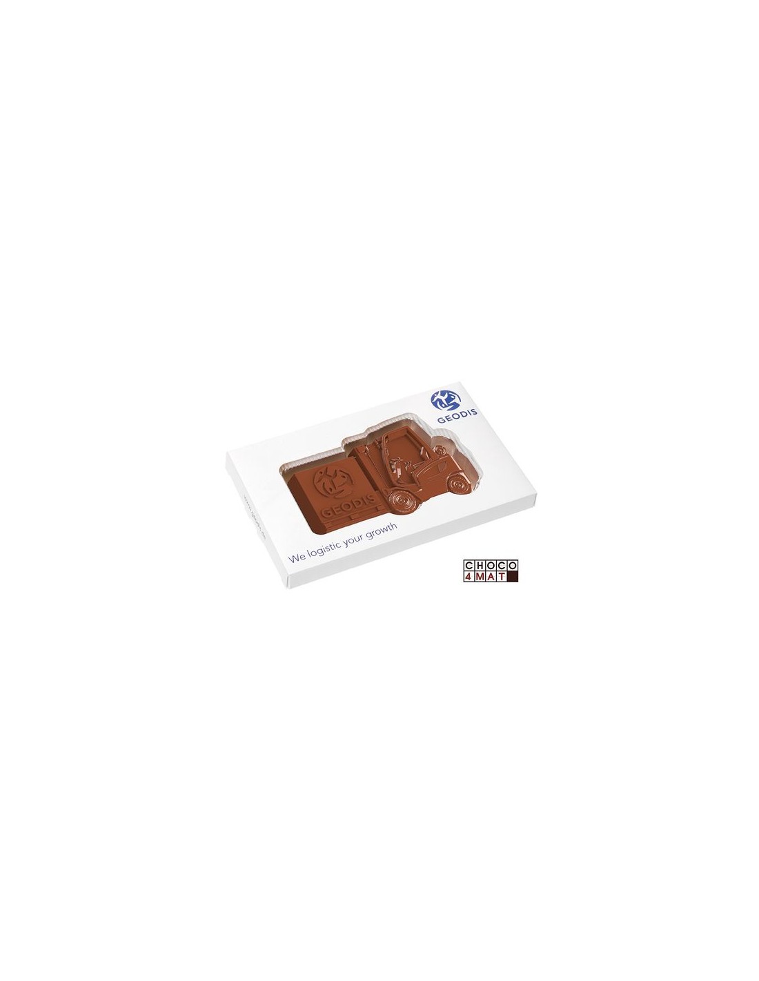 contenido : forma de chocolate 65 g.Saboro : chocolate con leche - vegano 42% cacao, chocolate con leche 33% cacao, chocolate con leche con du miel, chocolate blanco 36% manteca de cacao, chocolate Caramel Gold 40% cacao, chocolate negro 54% cacao, chocolate negro 72% cacao, chocolate rubí 47% cacao, chocolate Wholefruit 72% sin azúcares añadidos.Opciones de producto : papel blanco o kraft.Inforomación adicional : moldeado en R-PET (PET reciclado), papel blanco de serie, papel kraft elección opcional, posibilidad de personalizar el envasado y el chocolate (gofrado sobre el chocolate).Dimensiones : 175 x 107 x 15 mm.Cantidad Mínimo : 100 ejemplares.Fecha de caducidad mínima : 8 meses.