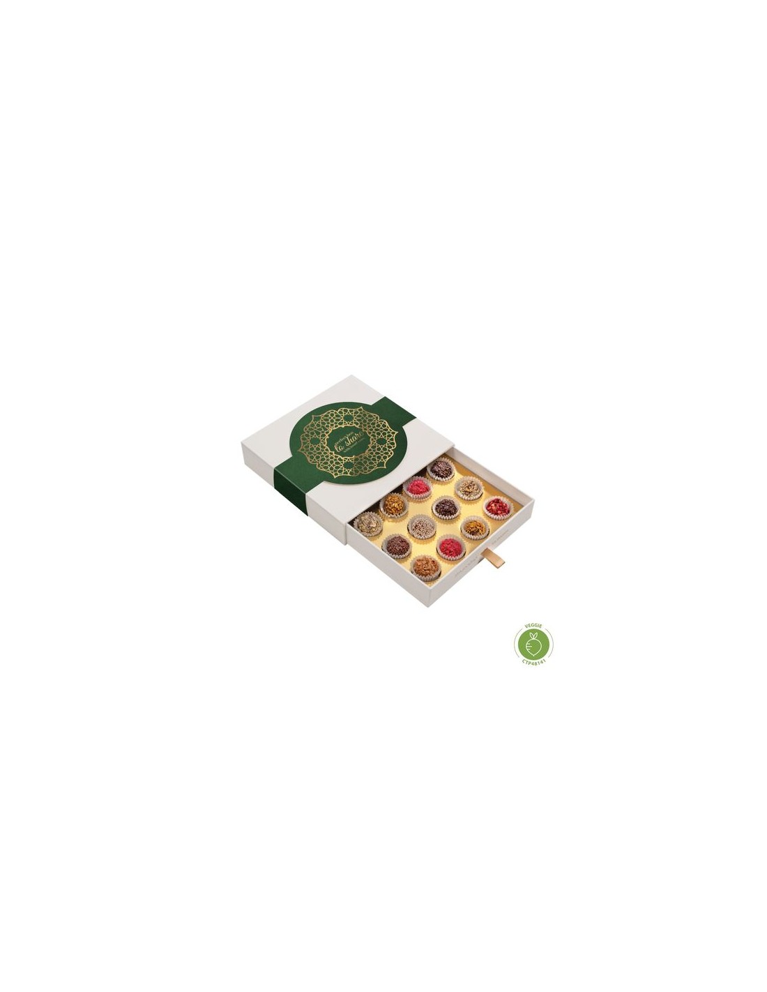 contenido : 16 truffas decoradas Art Déco 136 g.Saboro : mezcla de sabores.Opciones de producto : color de la caja : blanco o negro, etiqueta blanca o kraft.Inforomación adicional : lata metálica reutilizable según el principio de "residuo cero", etiqueta en papel blanco de serie, papel kraft elección opcional, moldeado en R-PET (PET reciclado).Dimensiones : 195 x 195 x 40 mm.Cantidad Mínimo : 50 ejemplares.Fecha de caducidad mínima : 6 meses.