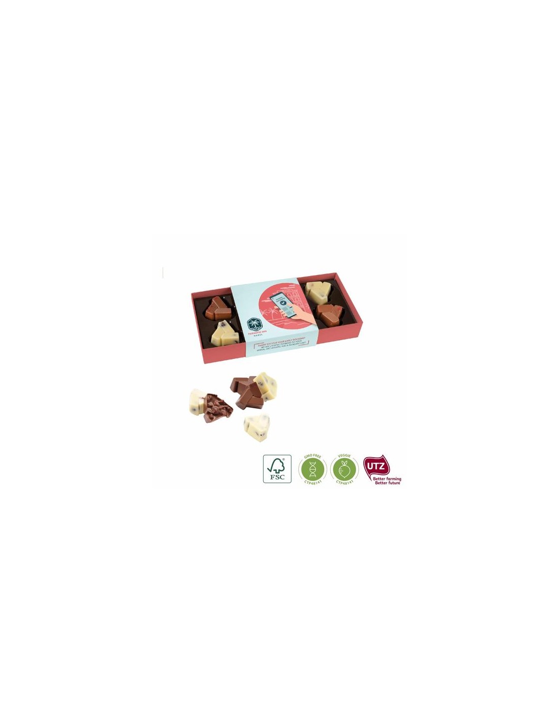 contenido : 4 chocolates con leche con arándanos liofilizadas y 4 chocolates blancos aux avellanas (total 72 g).Opciones de producto : papel blanco o kraft.Inforomación adicional : moldeado en R-PET (PET reciclado), papel blanco de serie, papel kraft elección opcional.Dimensiones : 90 x 190 x 30 mm.Cantidad Mínimo : 100 ejemplares.Fecha de caducidad mínima : 8 meses.Tipo de impresión : digital.
