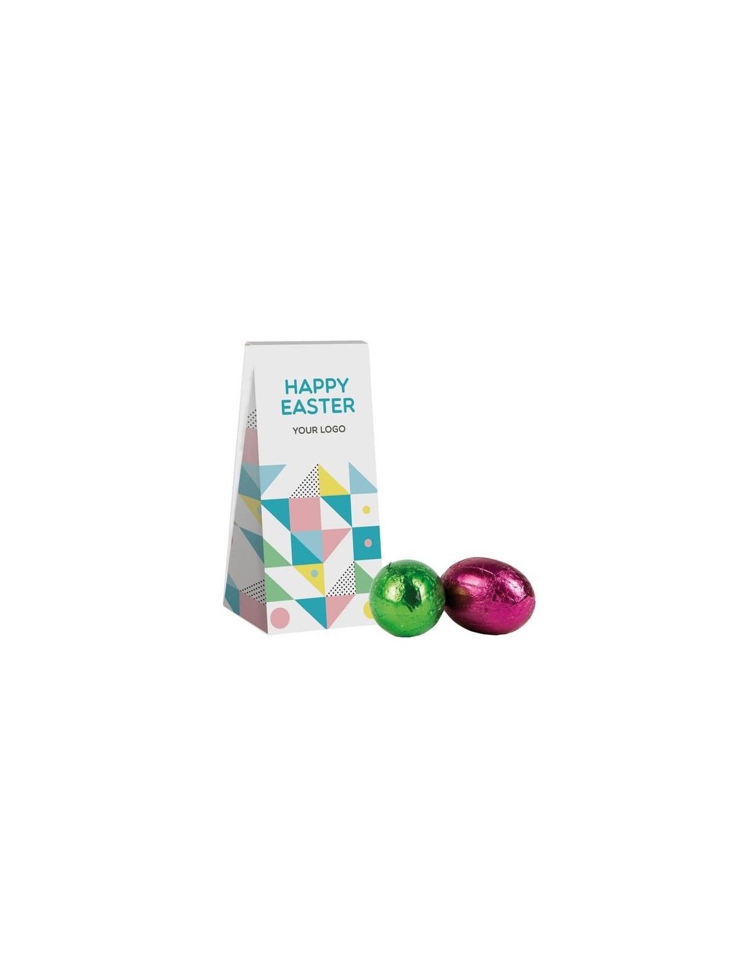 contenido : 3 huevos de chocolate relleno de nueces (total 24 g).Saboro : relleno de avellana recubierto de chocolate con leche.Opciones de producto : papel blanco o kraft.Inforomación adicional : color del papel: mezcla de colores, papel blanco de serie, papel kraft elección opcional.Dimensiones : 40 x 40 x 90 mm.Cantidad Mínimo : 500 ejemplares.Fecha de caducidad mínima : 6 meses.