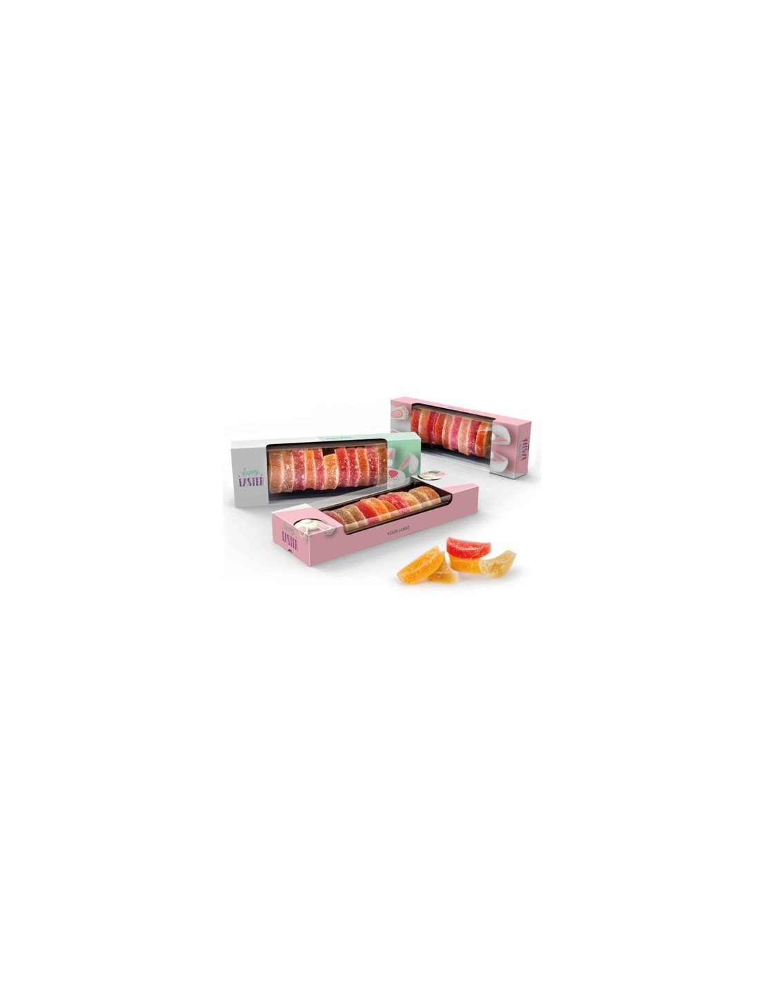 contenido : pasta de Frutas artesanales con azúcar (total 110 g).Saboro : mezcla : manzana, cereza, naranja, limón.Opciones de producto : papel blanco o kraft.Inforomación adicional : gelificante : pectine, moldeado en R-PET (PET reciclado), papel blanco de serie, papel kraft elección opcional.Dimensiones : 195 x 65 x 28 mm.Cantidad Mínimo : 100 ejemplares.Fecha de caducidad mínima : 4 meses.