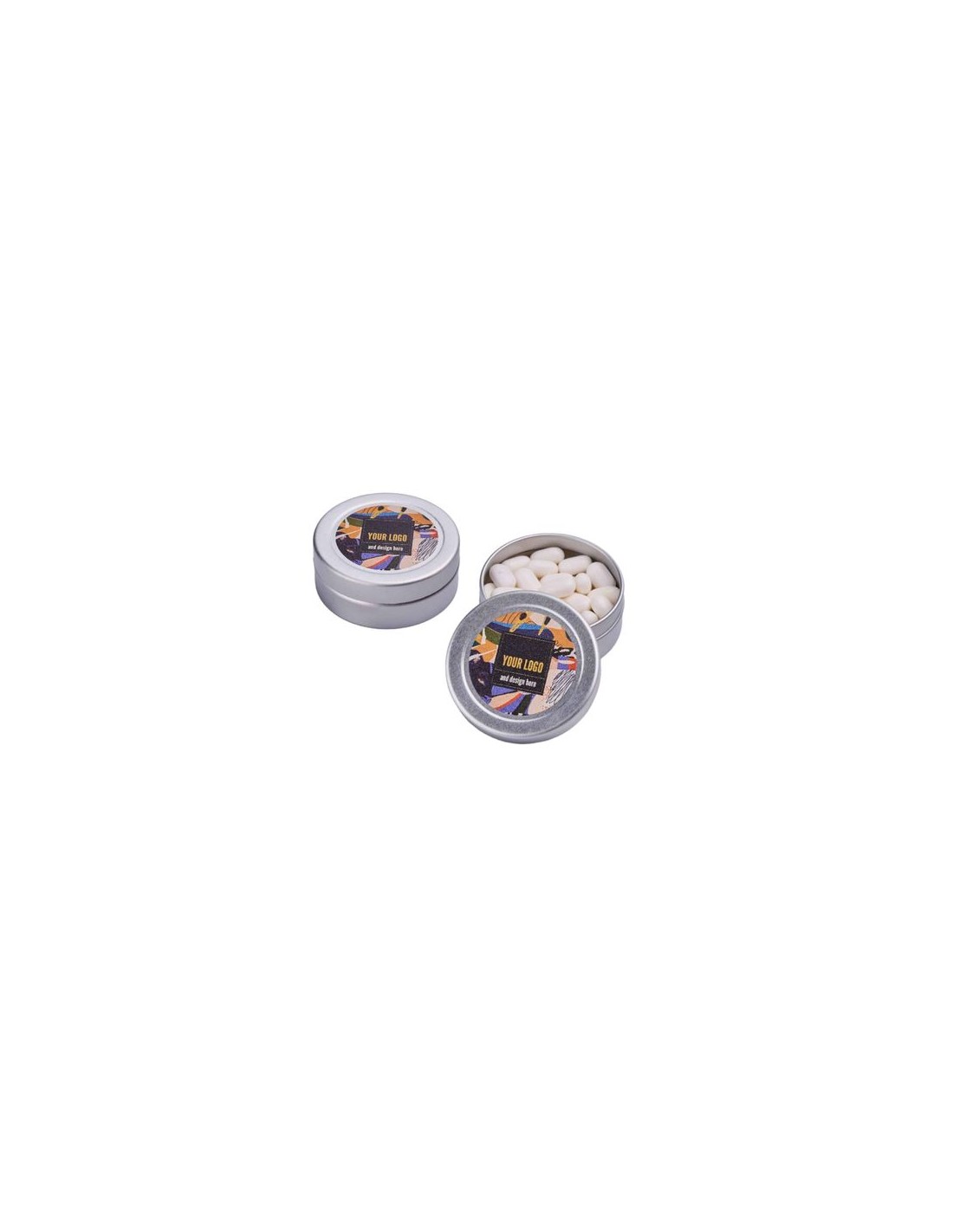 contenido : caramelos pequeños Minis 15 g.Saboro : menta,frutas.Opciones de producto : color de la caja: plata.Inforomación adicional : caja metálica reutilizable según el principio de "residuo cero"..Dimensiones : Ø 45 mm, h 18 mm.Cantidad Mínimo : de 250 piezas a 500 piezas.Fecha de caducidad mínima : 12 meses.