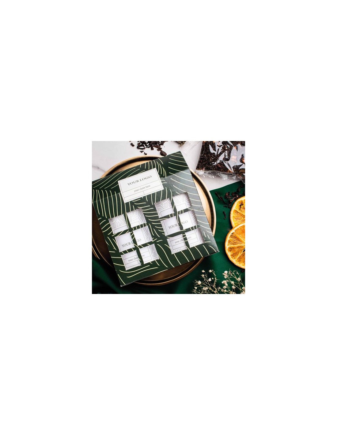 contenido : un SURTIDO de tés en hojas (total 100g).Saboro : frutos del bosque: pétales d'hibiscus yfrutas : frambuesa, aronia, aubépine, sureau, prunellier y sorobier des oiseleurs o Jardin Ensoleillé:, Jardin Ensoleillé : té verde Gunpowder, cáscara de limón, cáscara de naranja, ananas, pétales de toronesol, pétales de soci, Parfum de naranja : té Earl Grey au cáscara de naranja o.Opciones de producto : papel blanco o kraft.Inforomación adicional : Jardin Ensoleillé : té verde Gunpowder, cáscara de limón, cáscara de naranja, ananas, pétales de toronesol, pétales de soc, Parfum de naranja : té Earl Grey au cáscara de naranja o.Dimensiones : 155 x 78 x 167 mm.Cantidad Mínimo : 50 ejemplares.Fecha de caducidad mínima : 12 meses.