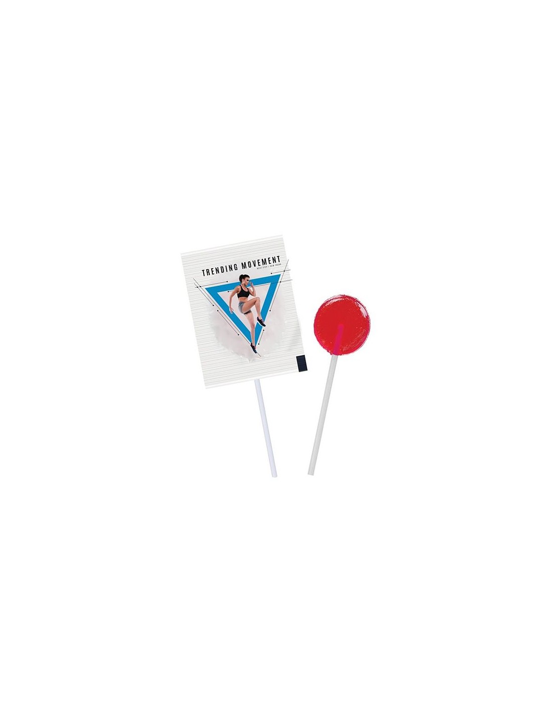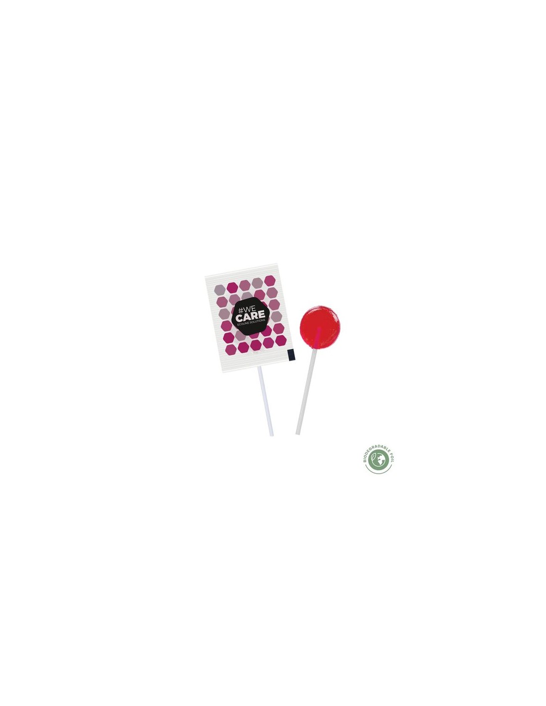 contenido : piruleta de frutas 7 g.Saboro : 10 Saboros a elegir:fresa, manzana, naranja, limón, cereza, frambuesa, frambuesas con limón (ácidas), menta, cola,hielo (colorea la lengua).Opciones de producto : color del papel: blanco o transparente, en option a base de azúcar de caña, monofilm reciclable al 100% o film compostable al 100%.Dimensiones : palo de piruleta de papel, posibilidad de preparar otros Saboros y colores de la piruleta (a pedido individual), sin azúcar a base d'isomalt.Dimensiones : 52 x 110 mm con bâton, 52 x 65 mm.Cantidad Mínimo : 7000 piezas.Fecha de caducidad mínima : piruletasenvuelto en film compostable: 12 meses, piruletas envuelto en film de una sola capa: 24 meses.