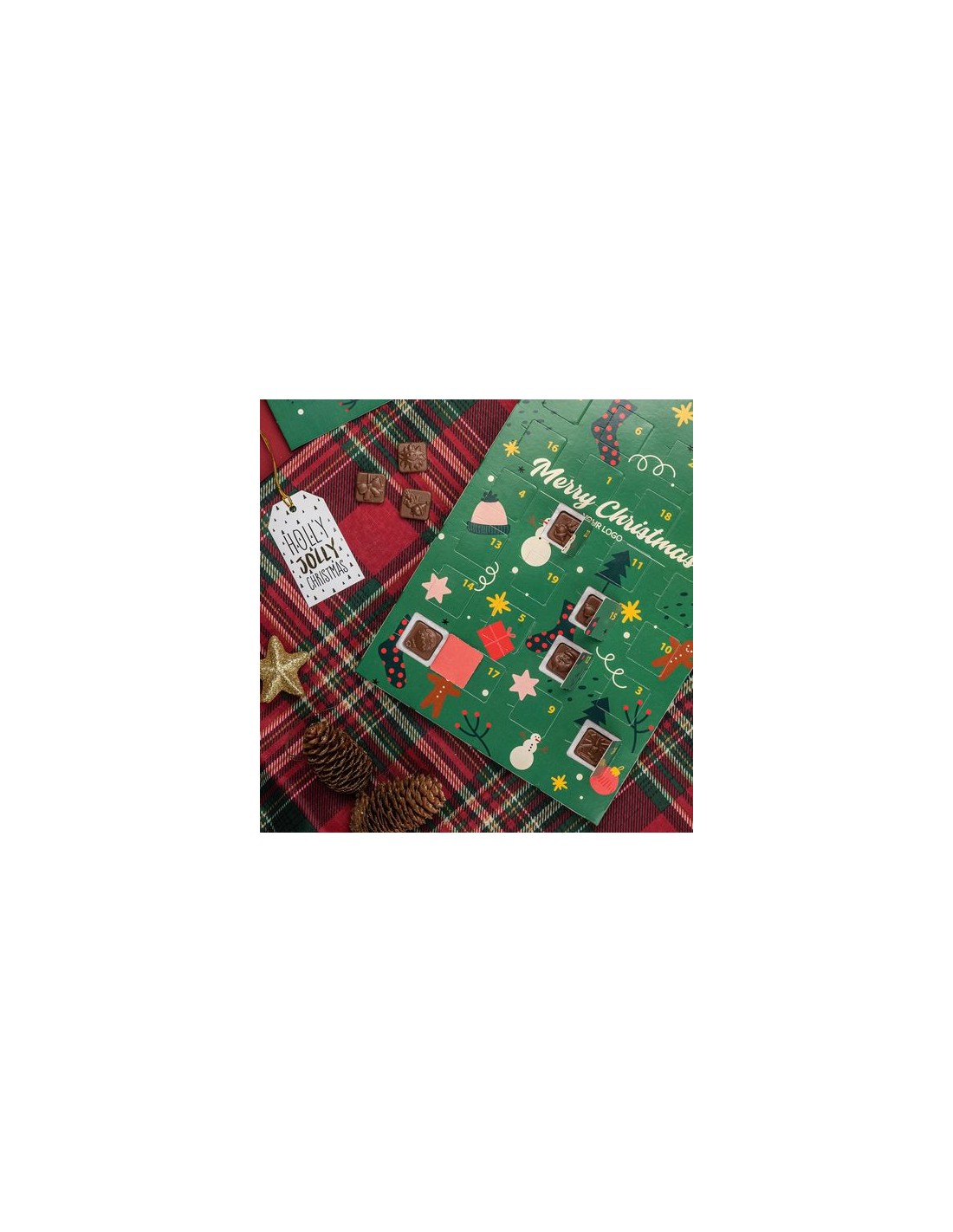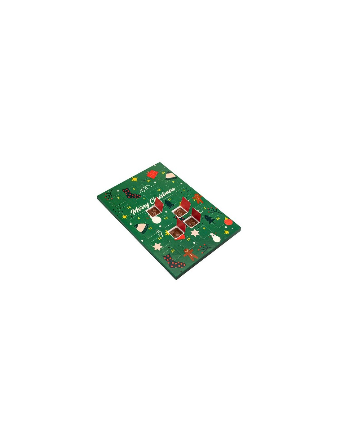 contenido : 24 chocolates (50 g en total)Saboro : chocolate con lecheOpciones de producto : impresión recto-verso, papel blanco, papel kraft o papel crudo con ajot de fibras de hierbaInforomación adicional : envasado biodégradable a 100%, molage de chocolate en papel, papel blanco de serie, papel kraft o papel crudo con ajot de fibras de hierba elección opcionalDimensiones : 197 x 284 x 10 mmCantidad Mínimo : 100 exFecha de caducidad mínima : 8 mesesTipo de impresión : digital.