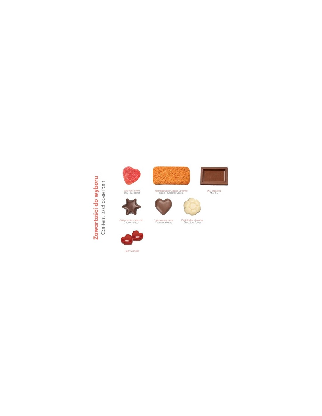 contenido : Jelly Pack en forma de corazón 10 g (fraise), o galleta especiada Caramélisé 5,5 g, o corazón de chocolate con leche 5 g, o fleur de chocolate con leche 6 g, o Heart Candies 3 g (cereza), o Mini-tableta 10 g.Saboro : chocolate con leche 33% cacao, chocolate blanco 36% manteca de cacao, chocolate negro 54% cacao, chocolate negro 72% cacao, chocolate rubí 47% cacao, chocolate Caramel Gold 40% cacao,, chocolate con leche au miel 33% de cacao, chocolate con leche - vegano 42% cacao, chocolate Wholefruit 72% sin azúcares añadidos, chocolate con leche y blanco.Opciones de producto : color de la etiqueta de la Mini-tableta 10 g: blanco, color del papel de la Mini-tableta: plata, oro, rojo, azul marine, negro, color del papel poro les corazóns y les fleurs en chocolate: plata, oro o rojo, papel blanco o kraft.Inforomación adicional : etiqueta en papel blanco de serie, papel kraft elección opcional, impresión recto-verso, Jelly Pack en forma de corazón y galleta especiada Caramélisé, emballés dans un film compostable a 100%, perforoation au dos permytant de faciliter l'enlèvement de la partie supérieure du carny.Dimensiones : 100 x 60 x 10 mm.Cantidad Mínimo : 500 ejemplares.Fecha de caducidad mínima : galletas y gelées: 6 meses; chocolate: 8 meses; caramelos: 12 meses.
