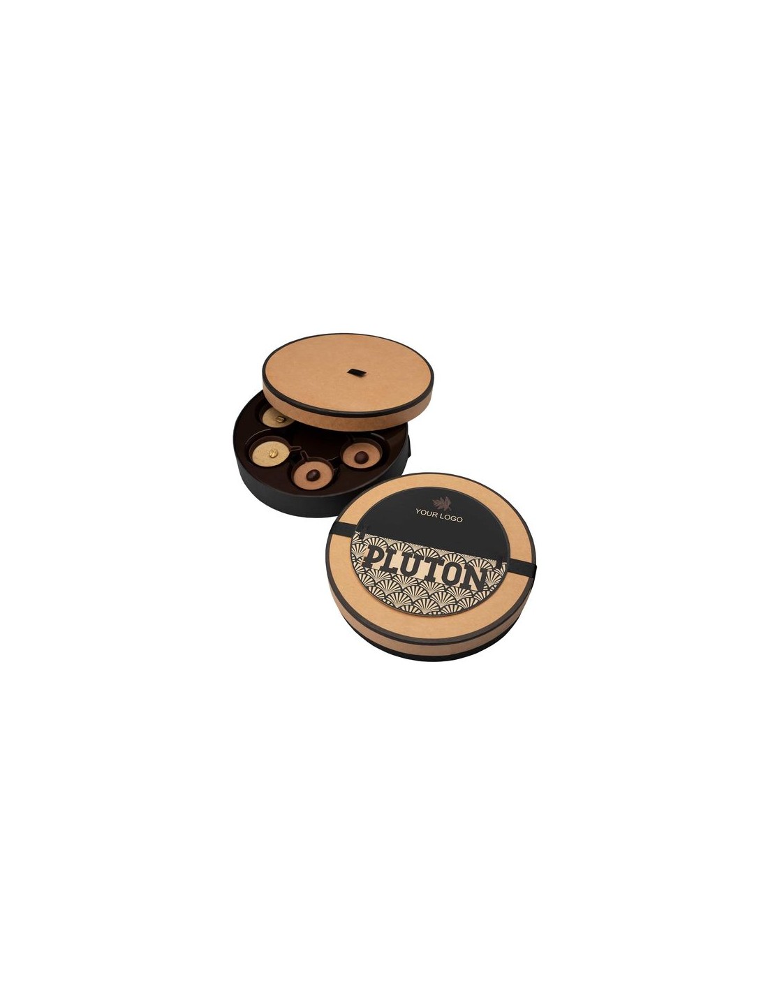 contenido : 6 chocolates praliné en forma de tazas con du chocolate belga rellenos au café Pluto 120 gSaboro : café con l'ajot de café PlutoOpciones de producto : papel blanco, papel kraft o papel crudo con ajot de fibras de hierbaInforomación adicional : lata metálica reutilizable según el principio de "residuo cero", color du ruban: negro, moldeado en R-PET (PET reciclado), papel blanco de serie, papel kraft o papel crudo con ajot de fibras de hierba elección opcionalDimensiones : Ø 197, h 40 mmCantidad Mínimo : 50 exFecha de caducidad mínima : 4 mesesTipo de impresión : digital.