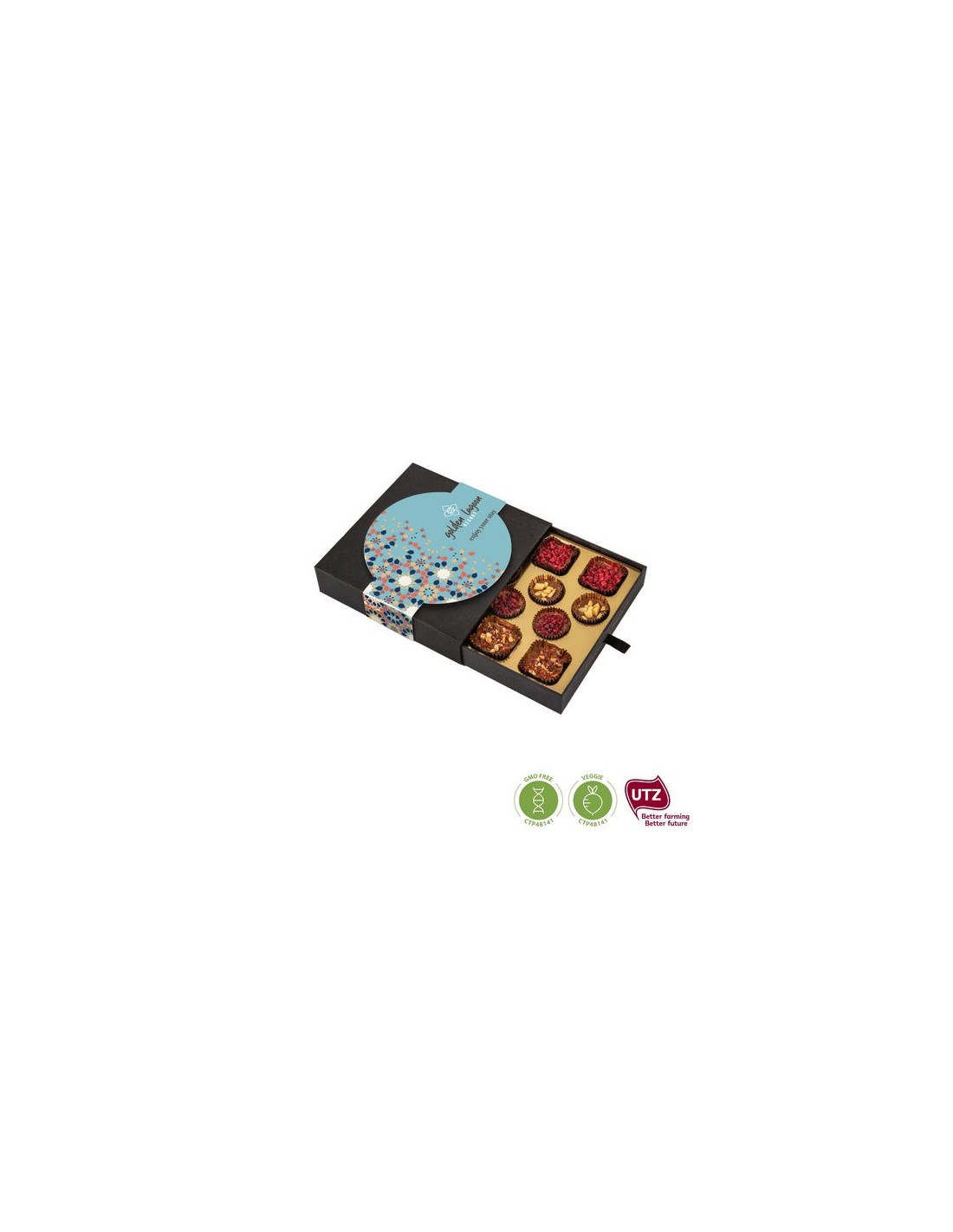 contenido : 12 chocolates rellenos Gold Cups 180 g.Saboro : una nota de cereza, capuchino con miel, turrón de caramelo, menta y chocolate con frambuesa.Opciones de producto : etiqueta blanca o kraft.Inforomación adicional : lata metálica reutilizable según el principio de "residuo cero", color de la caja: negro, etiqueta en papel blanco de serie, papel kraft elección opcional, moldeado en R-PET (PET reciclado).Dimensiones : 195 x 195 x 40 mm.Cantidad Mínimo : 50 ejemplares.Fecha de caducidad mínima : 4 meses.