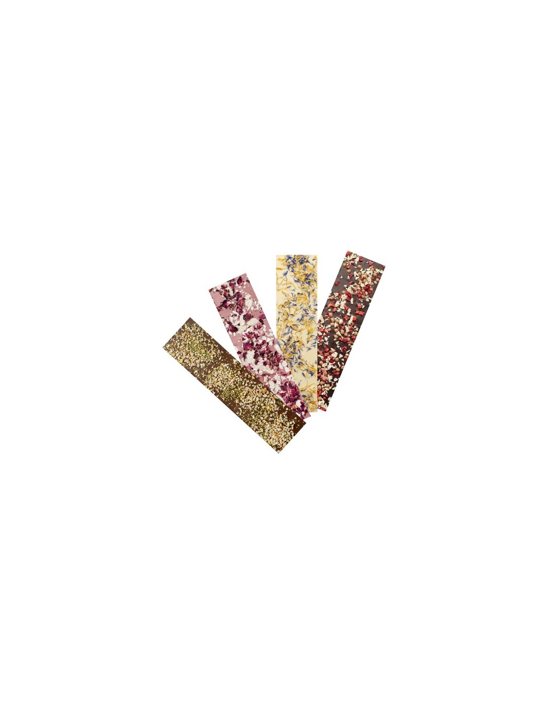 contenido : tableta de chocolate 100 g con una selección de coberturas.Saboro : chocolate con leche 33% cacao, chocolate blanco 36% manteca de cacao, chocolate negro 54% cacao, chocolate negro 72% cacao, chocolate rubí 47% cacao, chocolate Caramel Gold 40% cacao,, chocolate con leche y miel al 33% de cacao, chocolate con leche - vegano 42% cacao, chocolate Wholefruit 72% sin azúcares añadidos.Opciones de producto : diferentes tipos de coberturas a elegir, papel blanco o kraft.Inforomación adicional : moldeado en R-PET (PET reciclado), papel blanco de serie, papel kraft elección opcional.Dimensiones : 258 x 85 x 12 mm.Cantidad Mínimo : 100 ejemplares.Fecha de caducidad mínima : 8 meses.