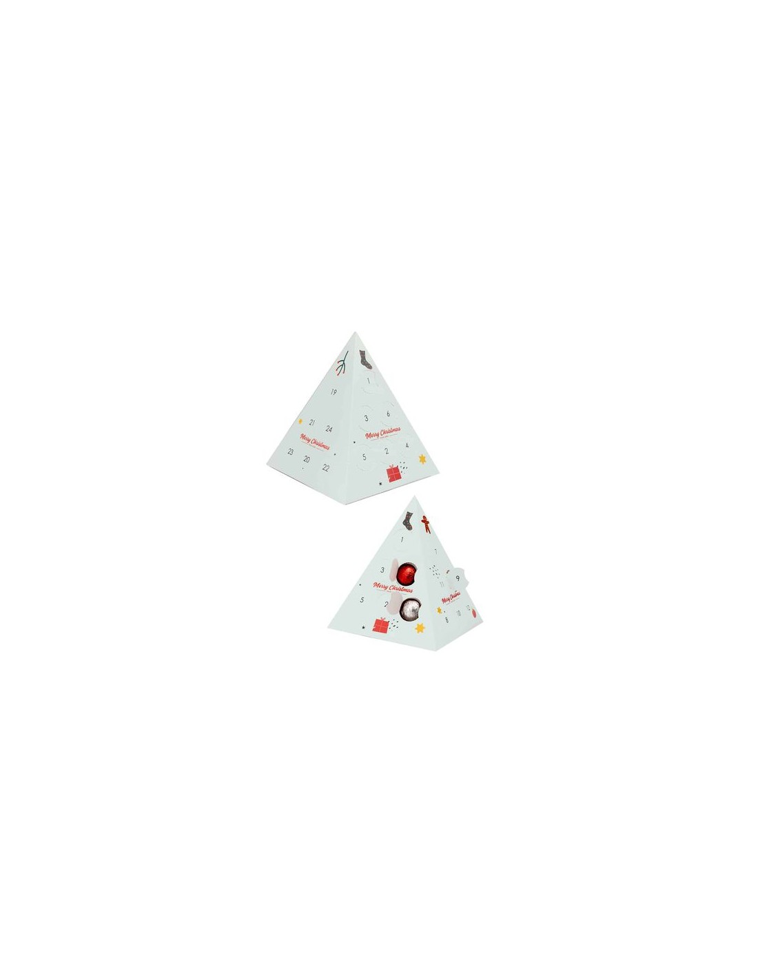 contenido : 24 boles de chocolates embaladas en lamina de colores (135 g en total)Saboro : forraje de avellana cubierta de chocolate con lecheOpciones de producto : papel blanco, papel kraft o papel crudo con ajot de fibras de hierbaInforomación adicional : moldeado en R-PET (PET reciclado), papel blanco de serie, papel kraft o papel crudo con ajot de fibras de hierba elección opcionalDimensiones : 145 x 145 x 168 mmCantidad Mínimo : 100 exFecha de caducidad mínima : 6 mesesTipo de impresión : digital.